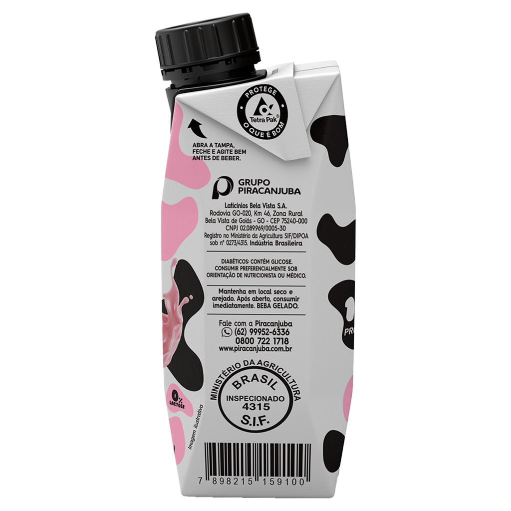 Bebida Láctea Piracanjuba Milky Moo Mimosa Zero Lactose 250ml A Piracanjuba Milky Moo Mimosa é uma bebida láctea UHT sabor brigadeiro branco com morango, desenvolvida para quem deseja unir sabor, nutrição e praticidade no dia a dia. Com 15g de proteínas por unidade, é perfeita para complementar a alimentação, fornecer energia e ajudar na manutenção e recuperação muscular. Além disso, é zero lactose, sendo indicada para pessoas com intolerância ou restrição ao consumo desse açúcar. ✅ Principais Benefícios: * 15g de proteínas por embalagem: contribuem para o ganho e manutenção da massa magra, além de auxiliar na recuperação após atividades físicas. * Zero lactose: ideal para intolerantes à lactose ou quem busca mais leveza na digestão. * Sabor inovador Mimosa: combina o doce do brigadeiro branco com a refrescância do morango, proporcionando uma experiência diferenciada e saborosa. * Pronto para consumo: embalagem prática de 250ml, ideal para levar na bolsa, mochila ou consumir em qualquer lugar. * Nutrição + Sabor: equilíbrio entre nutrientes essenciais e uma experiência indulgente. 🧴 Informações do Produto: Marca: Piracanjuba Linha: Milky Moo Tipo: Bebida láctea UHT Sabor: Mimosa (brigadeiro branco com morango) Volume: 250ml Zero Lactose: contém enzima lactase que facilita a digestão da lactose. Embalagem: Tetra Pak com tampa de rosca, prática e segura. 🔎 Informações Nutricionais (aproximadas por 250ml): Valor energético: ~160–180 kcal Proteínas: 15 g Carboidratos: 12–15 g Gorduras totais: 4–6 g Zero lactose 👩⚕️ Indicação de Consumo: Pode ser consumida a qualquer hora do dia, no café da manhã, lanches intermediários ou após atividades físicas. Ótima opção para quem busca um suplemento proteico saboroso e prático. ⚠️ Informações Importantes: Não contém glúten. Alérgicos: contém derivados de leite e pode conter derivados de soja. Produto indicado para o público em geral, incluindo pessoas com intolerância à lactose. Este produto não é iogurte.