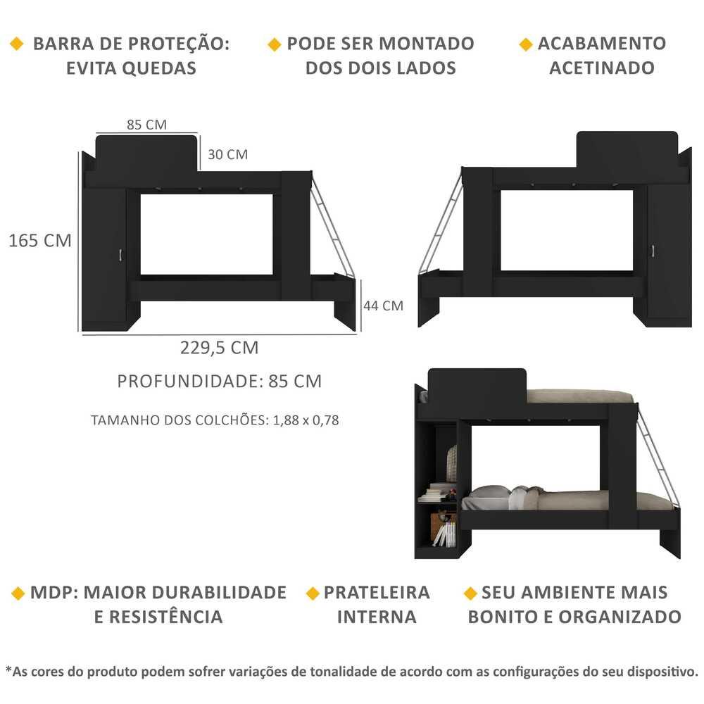 Produzido em MDP com acabamento acetinado (cerca de 20% de brilho), o Beliche 1 Porta Havana Multimóveis garante durabilidade e resistência. Suporta até 80kg em cada cama, possui barra de proteção na cama superior para evitar quedas, proporcionando noites de sono tranquilas e seguras, além de 1 porta lateral com prateleira interna, com amplo espaço interno para organizar roupas de cama ou pertences mais utilizados no dia a dia. A escada metálica em ângulo torna o acesso à cama superior muito mais fácil e prático. Além disso, o beliche pode ser montado dos dois lados - esquerdo ou direito. NÃO acompanha colchão (tamanho do colchão indicado: 188 x 78 cm). Esta é a escolha perfeita para deixar seu quarto mais convidativo para receber visitas ou acomodar seus filhos! Conteúdo da Embalagem: 1 (um) Beliche Kit Ferragem Manual de Montagem Dimensões do produto montado: Altura: 165cm | Largura: 229,5cm | Profundidade: 87cm *Você pode consultar as medidas detalhadas na imagem técnica do produto. *As cores do produto podem sofrer variações de tonalidade de acordo com as configurações do seu dispositivo. Imagem meramente ilustrativa. Decoração não acompanha o produto. O produto será entregue desmontado e não disponibilizamos o serviço de montagem.