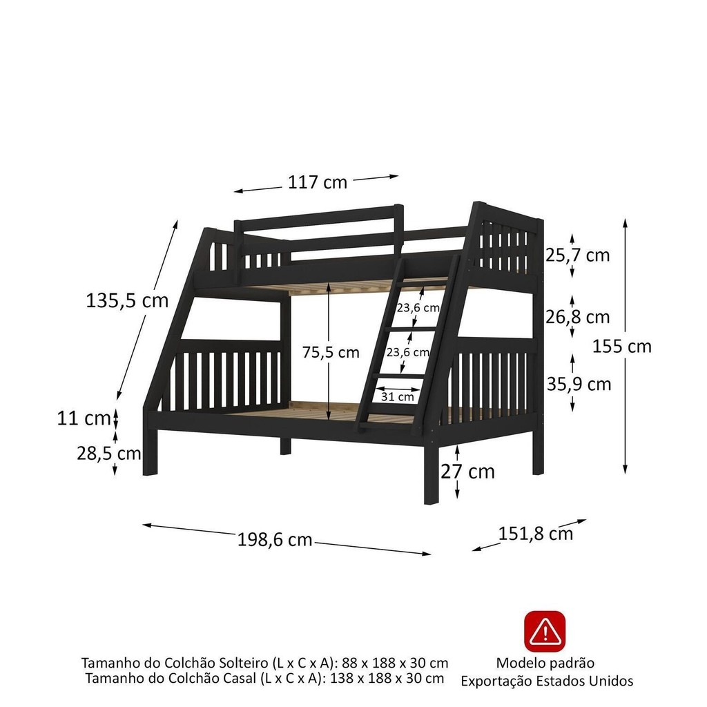 Esta Beliche Casal / Solteiro é uma ótima opção de móvel para quem tem um espaço reduzido em casa, sendo muito versátil elas são ideais para ambientes menores ou quartos acomodando de forma confortável, produzido de pinus maciço possui cercado na lateral superior da cama para noites tranquilas e seguras, para subir, na frente do movel há uma escada com 5 degraus, fixos, com design a qual não amassa o colchão; Esse tipo de móvel é sinônimo de qualidade e longa vida útil e, em um momento em que a sustentabilidade está em pauta, os móveis de madeira maciça podem ser uma boa alternativa ecológica, devido ao seu bom manejo e o benefício da reutilização. ATENÇÃO AS MEDIDAS DO COLCHÃO - BELICHE MODELO PADRÃO ESTADOS UNIDOS. Estilo: Moderno Peso (kg): 53.5 Garantia: 03 Meses Altura (cm): 155 Acabamento: Laca Largura (cm): 151.8 Possui Baú: Não Possui Pés: Não Possui Grade: Não Possui Nichos: Não Possui Portas: Não Comprimento (cm): 198.6 Possui Gavetas: Não Suporta Até (kg): 240 Possui Espelhos: Não Profundidade (cm): 198.6 Tamanho da Cama: Casal Tipo de Estrado: Removível Escala de Brilho: Semi-Brilho Acompanha Colchão: Não Origem do Produto: Nacional Ambiente Principal: Quarto Material Principal: Madeira Maciça Possui Prateleiras: Não Material do Estrado: Pinus Possui Escrivaninha: Não Tipo de Madeira Maciça: Pinus Acompanha Cama Auxiliar: Não Possui Trava de Segurança: Não Altura do Estrado até o Chão: 28.5 Peso Suportado por cada Cama: 120 Informações Complementares (Novo): Cama casal Suporta 240 kg - solteiro suporta 120 kg Altura do Estrado Superior até o Chão: 1.178 Permite a Utilização de Cama Auxiliar: Não Marca: Empório Paraíso Cor: Preto Cor do Produto: Preto Itens Inclusos: 1 Beliche + 1 Manual de Montagem + 1 Ferragem Cor Predominante: Preto Tamanho do Colchão Indicado (L x C): 138x188