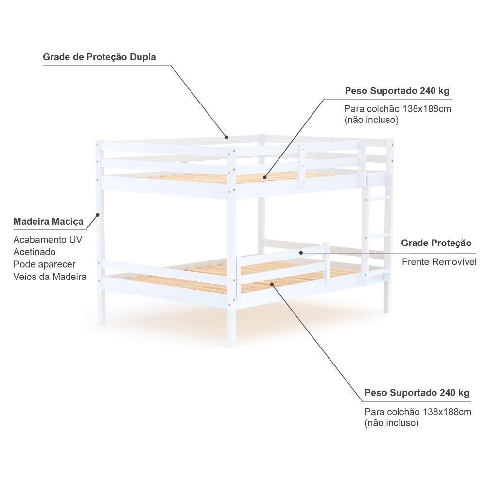 Beliche Casal Casal Slim Com Grade De Proteção Madeira Maciça Branco Housin DETALHES Acabamento: Branco UV (pode mostrar veios da madeira) Estrutura: Madeira Maciça de Pinus de Reflorestamento Medidas do Colchão da Cama de Casal (cm x cm): 188x138 (Não Incluso) Peso Suportado Cama de Casal: 240 Kg Diferenciais: Todo em Madeira, Escada Fixa, Grade de Proteção Dupla,Grade Removível. DIMENSÕES DO BELICHE MONTADO Altura (cm):148 Largura (cm):199 Profundidade (cm):146,5 INFORMAÇÕES COMPLEMENTARES Garantia do Fabricante: Prazo de 3 meses por defeito de fabricação Necessita de Montagem: SIM (Acompanha manual de montagem) Atenção:Não realizamos serviço de montagem e instalação. Imagens meramente ilustrativas. Cores e tonalidades podem variar. EMBALAGEM Peso (KG):65 Quantidade de Volumes:03 Material Principal: Madeira Maciça | Cor: Branco | Necessita Montagem: Sim | Acompanha Colchão: Não | Tipo de Cama: Beliche