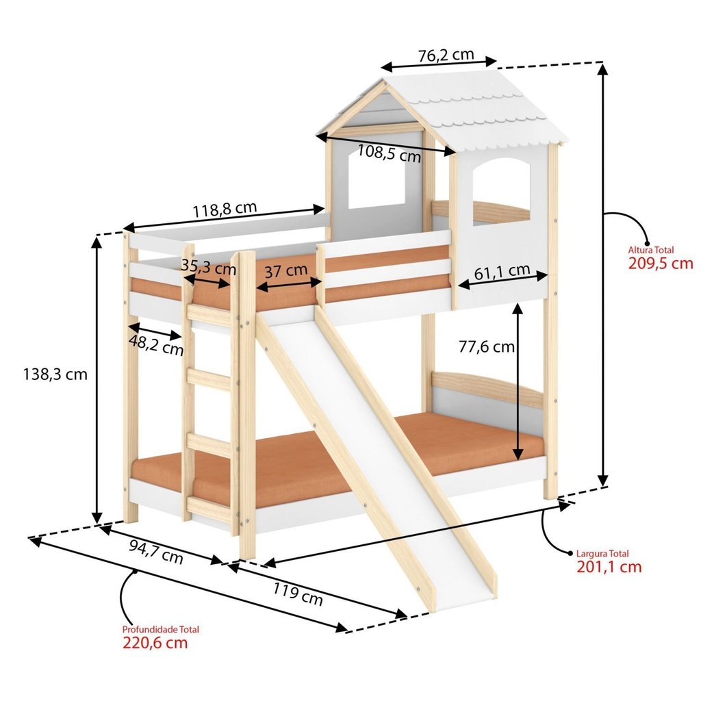 O Beliche Infantil Casinha com Escorregador Casatema é ideal para trazer a diversão para os dias e noites das crianças. Estrutura em madeira maciça e MDF, permite suportar até 90kg de peso distribuídos uniformemente. Pintura em poliéster que dá um toque de proteção e acabamento no produto, além de ser um sistema de pintura atóxico. Conta com uma estrutura em formato de casinha e um escorregador, que permite a criança usar a criatividade e se divertir de forma segura. Os colchões indicados são em tamanho padrão de solteiro de 1,88mx0,88m. Estilo: Moderno Modular: Não Peso (kg): 90.9 Garantia: 06 Meses Altura (cm): 209.5 Acabamento: Poliéster Extensível: Não Largura (cm): 202 Possui Baú: Não Possui Pés: Não Tipo de Cama: Beliche Possui Portas: Não Comprimento (cm): 188 Possui Casinha: Sim Possui Estante: Não Possui Gavetas: Não Possui Rodízio: Não Possui Telhado: Sim Suporta Até (kg): 90 Profundidade (cm): 94.7 Tamanho da Cama: Solteiro Tipo de Estrado: Fixo Acompanha Dossel: Não Escala de Brilho: Semi-Brilho Material dos Pés: Madeira Maciça Acompanha Colchão: Não Origem do Produto: Nacional Possui Iluminação: Não Tipo de Cabeceira: Lisa Ambiente Principal: Quarto Infantil Fabricação Própria: Sim Material Principal: MDF Possui Prateleiras: Não Acompanha Cabeceira: Sim Material do Estrado: Madeira Multilaminada Possui Escrivaninha: Não Sapatas Niveladoras: Não Material da Cabeceira: MDF Acompanha Escorregador: Sim Acompanha Cama Auxiliar: Não Tipo de Grade de Proteção: Grade Acompanha Grade de Proteção: Sim Variação do Telhado da Cama: Parcial Altura do Estrado até o Chão: 13 Tipo de Madeira Maciça dos Pés: Pinus Informações Complementares (Novo): Capacidade de peso informado distribuídos uniformemente. Permite a Utilização de Cama Auxiliar: Não Marca: Casatema Cor do Produto: Branco/Natural Itens Inclusos: 1 Beliche, Kit Ferragens, Manual de Montagem Cor Predominante: Branco Linha ou Coleção: Casatema Tamanho do Colchão Indicado (L x C): 88x188