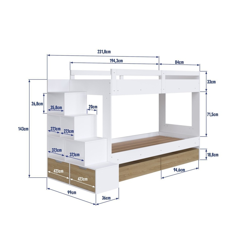 Beliche Infantil com Escada Nichos Gavetas Laterais e Gavetões Inferiores Branco/Aveiro Oak