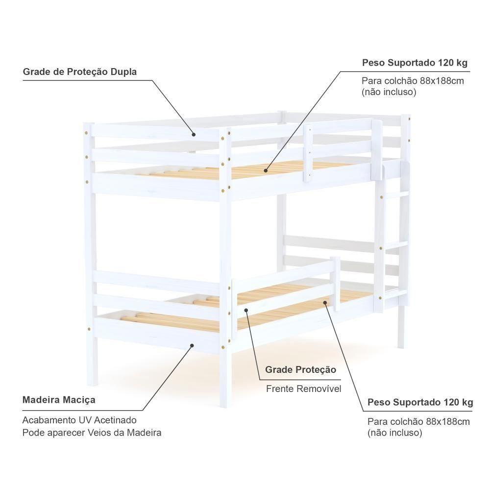 Beliche Infantil Slim Com Grade De Proteção Madeira Maciça Branco Housin DETALHES Acabamento: Branco UV (pode mostrar veios da madeira) Estrutura: Madeira Maciça de Pinus de Reflorestamento Medidas dos Colchões da Cama de Solteiro (cm x cm): 188x88 (Não Incluso) Peso Suportado Cama de Solteiro: 120 Kg Diferenciais: Todo em Madeira, Escada Fixa, Grade de Proteção Dupla, Grade Removível. DIMENSÕES DO BELICHE MONTADO Altura (cm):148 Largura (cm):199,4 Profundidade (cm):96,6 INFORMAÇÕES COMPLEMENTARES Garantia do Fabricante: Prazo de 3 meses por defeito de fabricação Necessita de Montagem: SIM (Acompanha manual de montagem) Atenção: Não realizamos serviço de montagem e instalação. Imagens meramente ilustrativas. Cores e tonalidades podem variar. EMBALAGEM Peso (KG):49 Quantidade de Volumes:03 Material Principal: Madeira Maciça | Cor: Branco | Necessita Montagem: Sim | Acompanha Colchão: Não | Tipo de Cama: Beliche
