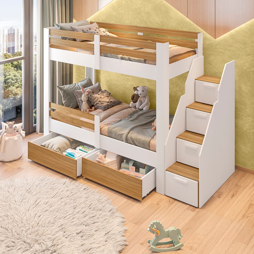 Para tornar o quarto mais descontraído e extremamente funcional a Beliche Star Plus não pode deixar de ser sua escolha. Extremamente moderna, com design exclusivo, ideal para quarto pequeno. E ainda para completar esse luxo de quarto completíssimo, temos 4 portas e 2 gavetas com muito espaço para organizar os objetos e roupas. Conta também com uma grade de proteção na cama inferior, deixando a noite das crianças ainda mais seguras. O quarto será o canto favorito da casa! Modular: Não Peso (kg): 114.9 Garantia: 03 Meses Altura (cm): 166.2 Acabamento: Melamínico Largura (cm): 237.3 Possui Baú: Não Possui Pés: Sim Possui Grade: Sim Tipo de Cama: Beliche Possui Portas: Sim Tipo de Porta: Basculante Altura dos Pés: 1.5 Comprimento (cm): 237.3 Possui Gavetas: Sim Possui Janelas: Não Possui Rodízio: Sim Suporta Até (kg): 320 Possui Espelhos: Não Profundidade (cm): 96 Tamanho da Cama: Solteiro Tipo de Estrado: Fixo Acompanha Dossel: Não Material dos Pés: Plástico Acompanha Colchão: Não Material da Porta: MDF Origem do Produto: Nacional Rodízio com Trava: Não Ambiente Principal: Quarto Infantil Fabricação Própria: Sim Material da Escada: MDP Material Principal: MDF Possui Prateleiras: Não Material do Estrado: Madeira Multilaminada Possui Escrivaninha: Não Sapatas Niveladoras: Não Acompanha Cama Auxiliar: Não Tipo de Puxador da Porta: Externo Cama Auxiliar com Rodízio: Não Acompanha Grade de Proteção: Sim Altura do Estrado até o Chão: 34 Cama Auxiliar Suporta Até (kg): 100 Material do Puxador da Porta: MDF Peso Suportado por cada Cama: 100 Cama Auxiliar Acompanha Colchão: Não Tipo de Dobradiça/Corrediça da Porta: Metálica Altura do Estrado Superior até o Chão: 135 Permite a Utilização de Cama Auxiliar: Não Marca: Casatema Cor: Branco/Montana Cor do Produto: Branco/Montana Cor Predominante: Branco Linha ou Coleção: Star Plus Revestimento do Produto: Melamínico Quantidade de Gavetas: 02 Gavetas Tamanho do Colchão Indicado (L x C): 88cm x 188cm