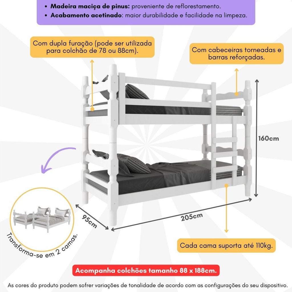 O Beliche Madeira Maciça - vira 2 Camas - com Colchões Inclusos Porto Multimóveis é um produto que une qualidade e versatilidade para atender às suas necessidades. Produzido 100% em madeira maciça (pinus) proveniente de reflorestamento, este beliche garante durabilidade e resistência, além de ser uma opção ecologicamente correta. Com barras reforçadas e suportando até 110kg, esse beliche oferece segurança e conforto para suas noites de sono. Ainda mais versátil, você pode utilizá-lo também como duas camas separadas. Possui dupla furação podendo ser utilizado para colchão de 78 ou 88cm. E não se preocupe: os colchões D23 com tratamento anti-ácaro e anti-alérgicoestão inclusos, garantindo proteção à saúde durante seu descanso. As cabeceiras torneadas com espessura de 8,5 x 8,5cm trazem um toque sofisticado ao design do móvel. Invista em qualidade e praticidade para sua casa ou apartamento sem abrir mão do estilo que só essa peça proporciona. Conteúdo da Embalagem: 1 (uma) Beliche 2 (dois) Colchões Kit Ferragem Manual de Montagem Dimensões do produto montado: Beliche - Altura: 160cm | Largura: 205cm | Profundidade: 95cm Colchões - Altura: 12cm | Largura: 188cm | Profundidade: 88cm *Você pode consultar as medidas detalhadas na imagem técnica do produto. *As cores do produto podem sofrer variações de tonalidade de acordo com as configurações do seu dispositivo. Imagem meramente ilustrativa. Decoração não acompanha o produto. O produto será entregue desmontado e não disponibilizamos o serviço de montagem.