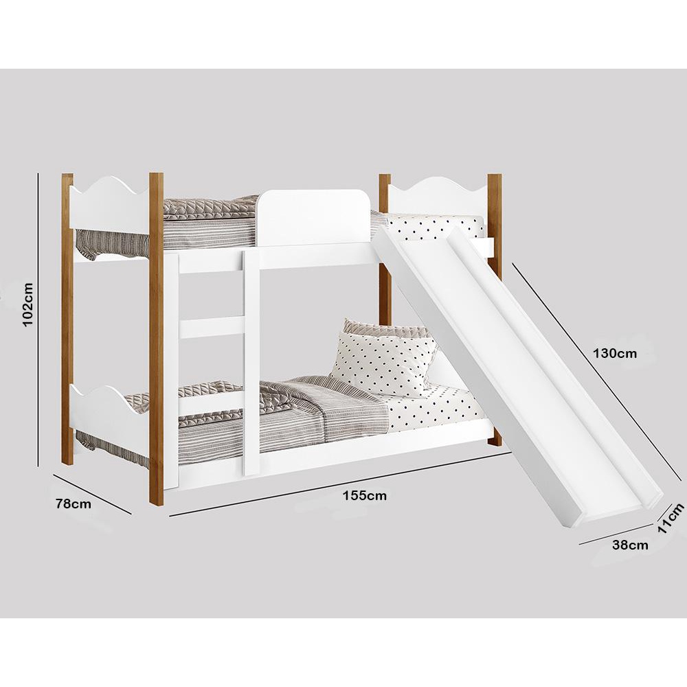 Marca: Gabrielli Móveis; Linha: Quarto; Modelo: Encanto com escorregador; Tamanho de cama: Infantil; Tipo de cama: Beliche; Material da cama: MDF/MDP; Acabamento: Pintura; Altura: 102 cm; Largura: 78 cm; Profundidade: 155 cm; Quantidade de cama: 02; Colchão Indicado: 70 cm x 150 cm; Peso suportado: 60 Kg por cama; Possui escorregador: Sim, com gancho fixador em aço; Peso suportado pelo escorregador: 60 kg; Quantidade de gavetas: Não se aplica; Tipo de corrediças: Não se aplica; Quantidade de portas: Não se aplica; Tipo de dobradiças: Não se aplica; Com puxador: Não se aplica; Material do puxador: Não se aplica; Com prateleiras: Não se aplica; Pé de apoio: Não se aplica; Requer montagem: Sim (kit montagem incluso); Condição do item: Novo; É kit: Sim; Altura da embalagem: 14 cm; Largura da embalagem: 37,2 cm; Comprimento da embalagem: 153,5 cm; Peso: 34,700 Kg; Embalagem do envio: Papelão e plástico; Informações adicionais: - Os objetos que ambientam as fotos não acompanham o produto; - O produto será entregue desmontado; - É de inteira responsabilidade do cliente a montagem do produto e/ou instalação, custos de transporte por escadas e/ou elevadores, guincho ou içamento, assim como possíveis avarias provenientes de manuseio inadequado; - Embora o produto acompanhe o manual de montagem, verifique a complexidade antes de decidir montá-lo sozinho, recomendamos que contrate um profissional de sua confiança; - Fique atento, nossas cores podem sofrer alterações dependendo do seu monitor; - ANTES DE MONTAR O SEU PRODUTO, certifique-se que todas as instruções dispostas no manual, bem como todas as ferragens descritas, estejam presentes dentro da embalagem. Verifique se há alguma peça avariada, caso esteja, prestaremos a devida assistência dentro do prazo da garantia.
