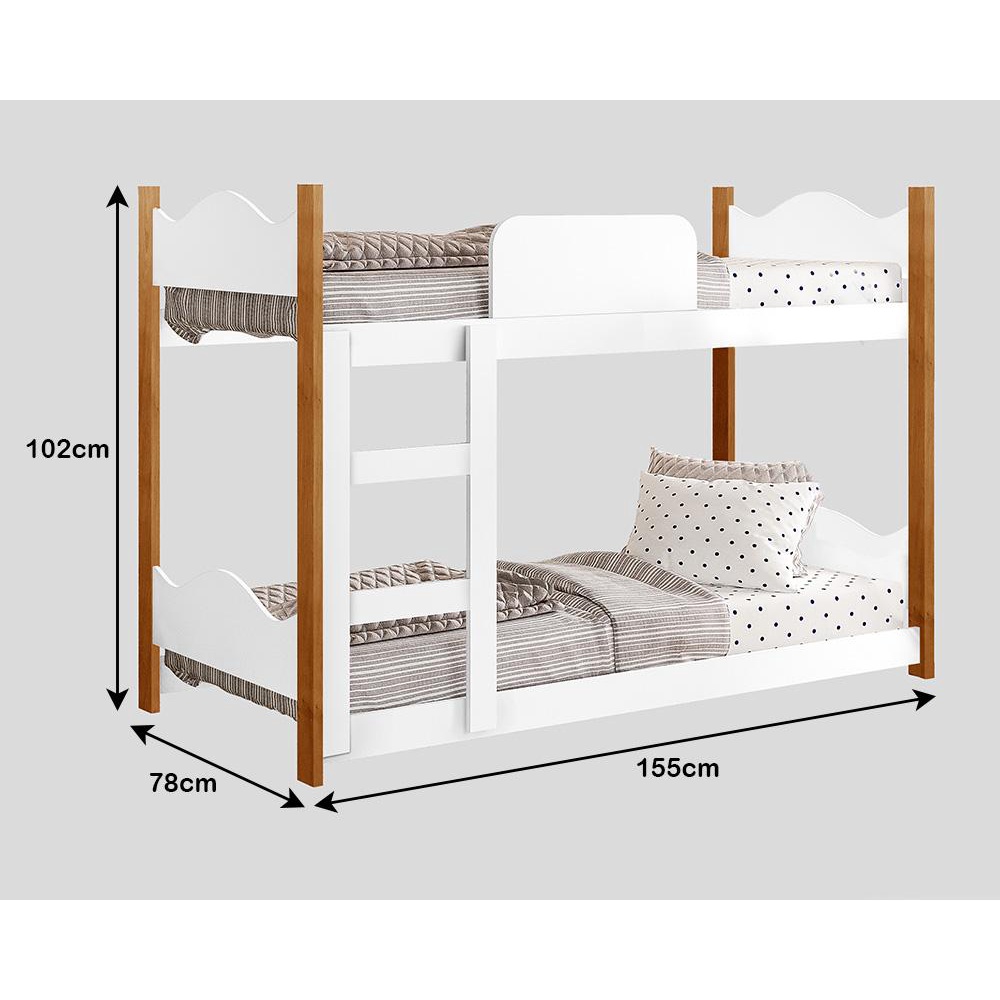 Marca: Gabrielli Móveis; Linha: Quarto; Modelo: Encanto; Tamanho de cama: Infantil; Tipo de cama: Beliche; Material da cama: MDF/MDP; Acabamento: Pintura; Altura: 102 cm; Largura: 78 cm; Profundidade: 155 cm; Quantidade de cama: 02; Colchão Indicado: 70 cm x 150 cm; Peso suportado: 60 kg por cama; Quantidade de gavetas: Não se aplica; Tipo de corrediças: Não se aplica; Quantidade de portas: Não se aplica; Tipo de dobradiças: Não se aplica; Com puxador: Não se aplica; Material do puxador: Não se aplica; Com prateleiras: Não se aplica; Pé de apoio: Não se aplica; Requer montagem: Sim (kit montagem incluso); Condição do item: Novo; É kit: Não; Altura da embalagem: 11 cm; Largura da embalagem: 37,2 cm; Comprimento da embalagem: 153,5 cm; Peso: 27,200 Kg; Embalagem do envio: Papelão e plástico; Informações adicionais: - Os objetos que ambientam as fotos não acompanham o produto; - O produto será entregue desmontado; - É de inteira responsabilidade do cliente a montagem do produto e/ou instalação, custos de transporte por escadas e/ou elevadores, guincho ou içamento, assim como possíveis avarias provenientes de manuseio inadequado; - Embora o produto acompanhe o manual de montagem, verifique a complexidade antes de decidir montá-lo sozinho, recomendamos que contrate um profissional de sua confiança; - Fique atento, nossas cores podem sofrer alterações dependendo do seu monitor; - ANTES DE MONTAR O SEU PRODUTO, certifique-se que todas as instruções dispostas no manual, bem como todas as ferragens descritas, estejam presentes dentro da embalagem. Verifique se há alguma peça avariada, caso esteja, prestaremos a devida assistência dentro do prazo da garantia.