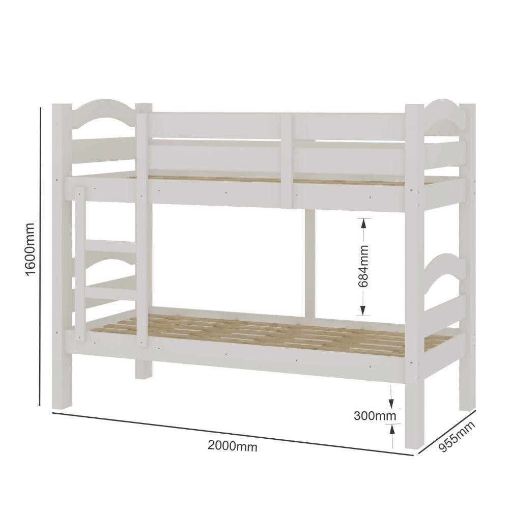 Beliche Robusto Exp Arauna 0,88 Branco Produto com otimo acabamento e melhor durabilidade. Mais praticidade e comodidade em seu ambiente. **Atencao colchao nao acompanha Beliche** MODELO: ROBUSTO Produto em Madeira de Pinus Macico e MDF Estrutura do Pe em Madeira (100 x 55mm) Pintura com impressao UV e Verniz Bordas em Esmalte PU e Fita de Borda Papel Soft Barra em MDF de 22 mm 5 Travessa no Estrado com Madeira Clean Reforcad Suporta ate 120kg com um colchao D-33 (cada cama) Colchao 0,88 x 1,88 Dimensoes do produto: Altura: 160 cm Largura: 95,5 cm Profundidade: 200 cm Peso: 58 kg Garantia: 3 meses