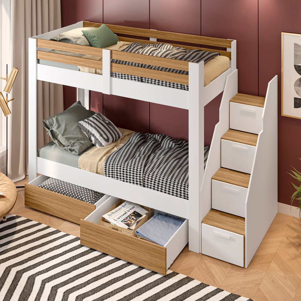 Transforme o quarto e otimize cada centímetro com o Beliche Solteiro Adulto Star Plus da Casatema. Esta não é apenas uma cama, mas uma solução completa de organização, perfeita para quartos de jovens ou adultos que valorizam funcionalidade e um design moderno. Projetado para o máximo aproveitamento, o Beliche Star Plus é a definição de móvel inteligente. O destaque é a sua escada lateral inovadora, onde cada degrau funciona como um nicho organizador. São 4 nichos perfeitos para guardar livros, objetos de decoração ou itens de uso diário, mantendo tudo ao alcance. Para completar a organização, o móvel conta com dois gavetões grandes com rodízios posicionados sob a cama inferior. Eles deslizam facilmente e oferecem um espaço de armazenamento prático e discreto para roupas de cama, sapatos ou brinquedos. Além disso, a escada possui montagem flex, permitindo que seja instalada do lado direito ou esquerdo, adaptando-se perfeitamente ao layout do seu ambiente. Fabricado em MDF e MDP de alta qualidade com acabamento em Melamínico, este beliche garante resistência e durabilidade, suportando até 100kg por cama. Suas dimensões totais são 166,2 cm de altura, 237,3 cm de largura e 96 cm de profundidade, ideal para colchões solteiro padrão (88x188 cm). Importante: o produto não inclui itens decorativos ou acessórios mostrados nas imagens. Confira o título e a ficha técnica completa para garantir que sua compra seja exatamente o que você espera! Garanta o encaixe perfeito! Planeje seu ambiente com cuidado comparando as medidas do produto com o espaço disponível e reserve uma folga de até 2 cm para posicioná-lo com conforto. Estilo: Moderno Peso (kg): 119.6 Garantia: 06 Meses Altura (cm): 166.2 Acabamento: Melamínico Largura (cm): 237.3 Possui Baú: Não Possui Pés: Sim Possui Grade: Sim Tipo de Cama: Beliche Possui Nichos: 4 Possui Portas: Sim Tipo de Porta: Misto (Bater e Basculante) Altura dos Pés: 1.5 Comprimento (cm): 237.3 Possui Gavetas: Sim Possui Rodízio: Sim Suporta Até (kg): 320 Possui Espelhos: Não Profundidade (cm): 96 Tamanho da Cama: Solteiro Tipo de Estrado: Fixo Escala de Brilho: Semi-Brilho Gaveta com Chave: Não Material dos Pés: Plástico Acompanha Colchão: Não Material da Porta: MDF Origem do Produto: Nacional Rodízio com Trava: Não Acabamento dos Pés: BP Ambiente Principal: Quarto Fabricação Própria: Sim Material da Gaveta: MDF Material Principal: MDF Possui Prateleiras: Não Acabamento da Porta: BP Material do Estrado: Madeira Multilaminada Possui Escrivaninha: Não Sapatas Niveladoras: Não Acabamento da Gaveta: Melamínico Peso Máximo por Gaveta: 4 Acompanha Cama Auxiliar: Não Tipo de Puxador da Porta: Externo Escala de Brilho da Porta: Semi-Brilho Possui Trava de Segurança: Não Tipo de Puxador da Gaveta: Embutido Escala de Brilho da Gaveta: Semi-Brilho Tipo de Corrediça da Gaveta: Madeira Altura do Estrado até o Chão: 34 Peso Suportado por cada Cama: 100 Informações Complementares (Novo): - Fazer uma verificação mensal e realizar o reaperto dos parafusos do produto, caso necessário. - Proibido pular sobre as camas. - O produto destina-se ao uso de uma pessoa por cama sempre. O produto jamais deverá ser usado por mais de uma pessoa por cama Tipo de Dobradiça/Corrediça da Porta: Metálica Altura do Estrado Superior até o Chão: 1.38 Permite a Utilização de Cama Auxiliar: Não Marca: Casatema Cor Flex: Não Cor: Montana/Branco Cor do Produto: Branco/Montana Itens Inclusos: 1 Beliche + Kit de ferragens + manual de montagem Cor Predominante: Branco Linha ou Coleção: Star Plus Quantidade de Gavetas: 02 Gavetas Tamanho do Colchão Indicado (L x C): 88x188