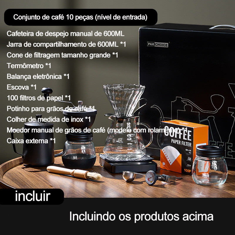 🥳Bem-vindo à loja Belifou Talheres, siga a loja para obter mais cupons🎟️ 🥰Se você tiver alguma dúvida sobre o produto, por favor deixe UMA Mensagem para o serviço ao cliente e nós responderemos a tempo! 🚚Envio de São Paulo, despachado em até 12-24 horas Caixa de presente com dez peças para café artesanal, modelo básico: uma ótima opção para os amantes de café. 💥Básico(kit 10 ): Chaleira Para Servir(600ML)*1 Copo De Filtro Grande*1 Termômetro*1 Balança Eletrônica*1 Escovar*1 100 Folhas De Papel De Filtro*1 Lata de café em pó*1 Colher medidora de aço inoxidável *1 Moedor De Café Manual*1 600ml Pote Para Compartilhar*1 💥Avançado(kit 10 ): Chaleira Para Servir(600ML)*1 Copo De Filtro Grande*1 Termômetro*1 Balança Eletrônica*1 Escovar*1 100 Folhas De Papel De Filtro*1 Lata De Café Em Pó*1 Colher Medidora De Aço inoxidável *1 Moedor De Café Elétrico*1 600ml Pote Para Compartilhar*1 Material e configuração: O bule de café artesanal e o bule para compartilhar são feitos de vidro, transparente e fácil de limpar. Eles são combinados com grandes copos de filtro de vidro e são adequados para uma variedade de quantidades de pó de café. O moedor manual adota um design com rolamento, a colher medidora de aço inoxidável é durável, o termômetro e a balança eletrônica ajudam a controlar com precisão os parâmetros de preparo, e o papel de filtro, o reservatório de pó, a escova e a caixa externa são completos para atender às necessidades de todo o processo de preparo artesanal. Vantagens: Dez ferramentas práticas são equipadas em um único local, desde a moagem, o preparo até o compartilhamento, abrangendo todo o processo de preparo artesanal, e os iniciantes podem começar rapidamente; a embalagem da caixa de presente de capa dura é requintada e tem um senso de ritual para uso próprio, além de ser adequada para presentear. Os copos têm uma aparência elegante e é fácil observar o estado da extração do café. Cenários aplicáveis: É adequado para iniciantes em café criarem um cantinho dedicado ao café em casa e aproveitarem a diversão do café feito à mão todos os dias; também pode ser usado como um presente para os amantes de café para ajudá-los a explorar o sabor do café; um conjunto é colocado no escritório e é usado para preparar café à tarde para refrescar e adicionar atmosfera.