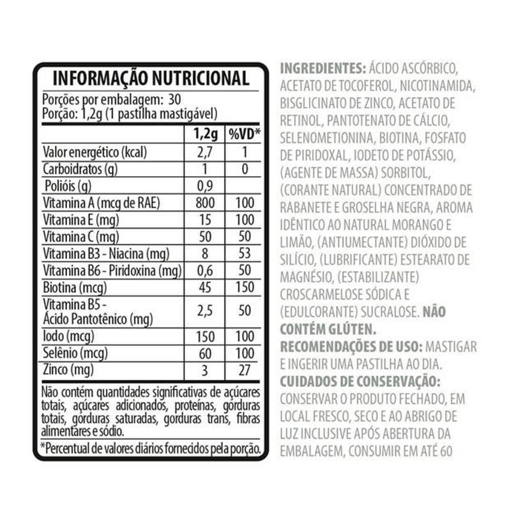 Belt Hair, Nail and Skin Bariatric Mastigável foi desenvolvido especialmente para os bariátricos que estão no período do pós operatório (dieta liquida, pastosa, branda) Como usar Mastigar e ingerir 1 pastilha ao dia. A formulação mastigável facilita a ingestão e absorção dos nutrientes essenciais para o fortalecimento capilar, das unhas e melhoria da saúde da pele. Ingredientes: ÁCIDO ASCÓRBICO, ACETATO DE TOCOFEROL, NICOTINAMIDA, BISGLICINATO DE ZINCO, ACETATO DE RETINOL, PANTOTENATO DE CÁLCIO, SELENOMETIONINA, BIOTINA, FOSFATO DE PIRIDOXAL, IODETO DE POTÁSSIO, (AGENTE DE MASSA) SORBITOL, (CORANTE NATURAL) CONCENTRADO DE RABANETE E GROSELHA NEGRA, AROMA IDÊNTICO AO NATURAL MORANGO E LIMÃO, (ANTIUMECTANTE) DIÓXIDO DE SILÍCIO, (LUBRIFICANTE) ESTEARATO DE MAGNÉSIO, (ESTABILIZANTE) CROSCARMELOSESÓDICAE = (EDULCORANTE) SUCRALOSE