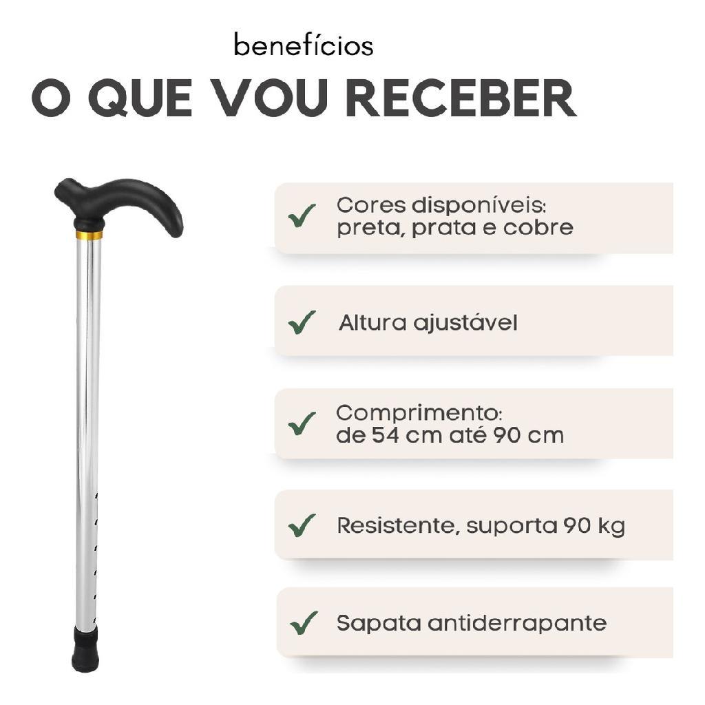 ***** ATENÇÃO!! APROVEITE E TENHA SEU PRODUTO COM O ENVIO MAIS RÁPIDO!! - FLEX SÃO PAULO E GRANDE SÃO PAULO: COMPRANDO ATÉ ÀS 12h00 RECEBE NO MESMO DIA!! - COLETA: COMPRANDO ATÉ ÀS 15h00 ENVIAMOS NO MESMO DIA!! ***** * TODOS OS NOSSOS PRODUTOS ACOMPANHAM NOTA FISCAL * A Bengala Bastão em Alumínio com Ajuste é recomendada para auxiliar no equilíbrio do usuário, sendo prática, leve e resistente. Altura aproximada de 54 cm a 90 cm, com 6 opções de ajustes Seu design em formato de T proporciona maior estabilidade e equilíbrio, garantindo uma caminhada mais segura e confortável. Além disso, a regulagem de altura permite que você ajuste a bengala de acordo com suas necessidades, proporcionando um encaixe perfeito para sua altura. - Diferenciais: * Proporciona equilíbrio e suporte ao caminhar; * Estrutura em alumínio; * Auxilia na locomoção; * Ajuste de altura com cinco furos e um pino de trava; * Capacidade: 90 kg; * Altura mínima aproximada: 54 cm; * Altura máxima aproximada: 90 cm; * Apoio de mão anatômico de 12 cm. - Principais Indicações: * Pessoas com dificuldades para se movimentar devido à idade; * Doenças e problemas traumáticos como fraturas. - Composição: * Alumínio; * Apoio de mão anatômico modelo T; * Ajuste de altura; * Sapata antiderrapante; * Cores disponíveis: preta, prata e bronze