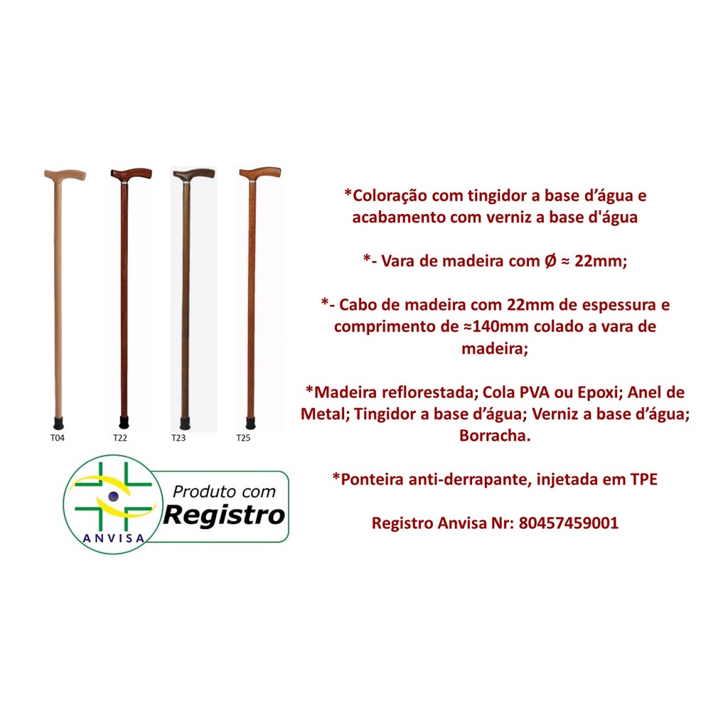 Bengala perfeita para idosos e praticante de caminhada, muito leve e resistente, produzida em madeira reflorestada de primeira qualidade e de longa duração, com certificado ANVISA e avaliada por profissionais qualificados **** PESA APENAS 450 gramas **** *Altura total 98 cm ( é necessário medir no paciente o local correto, marcar na bengala e após serrar ) *Ponteira própria de longa duração com calota interna que aumenta a resistência e reduz o desgaste *Apoio de mão com acabamento arredondado e liso *Anti ruido *Coloração com tingidor a base d’água e acabamento com verniz a base d'água *- Vara de madeira com Ø ≈ 22mm; *- Cabo de madeira com 22mm de espessura e comprimento de ≈140mm colado a vara de madeira; *Madeira reflorestada; Cola PVA ou Epoxi; Anel de Metal; Tingidor a base d’água; Verniz a base d’água; Borracha. *Ponteira anti-derrapante, injetada em TPE Registro Anvisa Nr: 80457459001