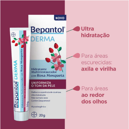 O que é e para que serve o Bepantol Derma hidratante Multirrestaurador com Rosa Mosqueta? O Creme Hidratante Multirrestaurador com Rosa Mosqueta para pele normal e seca é indicado para áreas escurecidas como axila e virilha, e também para a região ao redor dos olhos. Sua fórmula com Óleo de Rosa Mosqueta, Dexpantenol e Lanolina, uniformiza o tom da pele, melhorando a aparência de cicatrizes, além de promover ultra hidratação. Benefícios e diferenciais Para rosto e corpo. Pele normal a seca. Uniformiza o tom da pele. Melhora a aparência de cicatrizes. Promove ultra hidratação. Hipoalergênico. Como usar o Bepantol Derma Hidratante Multirreparador com Rosa Mosqueta? Aplique o creme sobre a pele e massageie suavemente, até completar a absorção. É verdade que o Bepantol clareia a pele? Após seu lançamento e popularização, muitos usuários encontraram outras finalidades para o Bepantol Derma Creme. Embora a marca deixe explícito que o produto não possui ação clareadora, o creme pode ajudar a manter uma aparência mais saudável em manchas na pele, olheiras e marcas escuras nas axilas e virilha. Ingredientes Dexpantenol (Pró-Vitamina B5), lanolina, óleo de amêndoas doces e rosa mosqueta. Advertências Uso externo. Não ingerir. Não recomendado para alérgicos aos componentes da fórmula. Caso haja contato com os olhos, lave-os abundantemente. Se houver irritação, suspenda o uso imediatamente e procure orientação médica. Mantenha fora do alcance das crianças e animais domésticos.