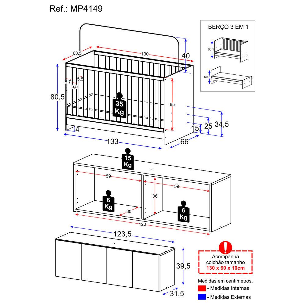 O Berço 3 em 1 com Colchão e Armário Aéreo 4 portas Multimóveis MP4149 é produzido em MDP, garantindo durabilidade e resistência, e possui acabamento acetinado (cerca de 20% de brilho), que confere beleza aos produtos. O berço é padrão nacional (tamanho do colchão 1,30 x 0,60 m), se transforma em sofá e minicama, acompanhando o crescimento do seu filho, possui 3 regulagens de altura para o colchão e acompanha suporte para mosquiteiro, garantindo noites mais tranquilas de sono para o bebê. As grades do berço são produzidas em MDF/madeira maciça de pinus. O berço é certificado pelo INMETRO sob o Selo n 000332/2025. Acompanha colchão (suporta até 50kg) em espuma revestido com tecido poliéster, que possui conforto macio, tratamento antiácaro e antialérgico. Com design moderno, o armário aéreo possui 4 portas com amplo espaço interno para organizar os objetos do bebê, suportando até 12kg em seu interior. Conteúdo da Embalagem: 1 (um) Berço 1 (um) Colchão 1 (um) Armário Aéreo Kit Ferragem Manual de Montagem Dimensões do produto montado: Berço - Altura: 80,5cm | Largura: 133cm | Profundidade: 66cm Colchão - Altura: 10cm | Largura: 130cm | Profundidade: 60cm Armário Aéreo - Altura: 39,5cm | Largura: 123,5cm | Profundidade: 31,5cm *Você pode consultar as medidas detalhadas na imagem técnica do produto. *As cores do produto podem sofrer variações de tonalidade de acordo com as configurações do seu dispositivo. Imagem meramente ilustrativa. Decoração não acompanha o produto. O produto será entregue desmontado e não disponibilizamos o serviço de montagem.