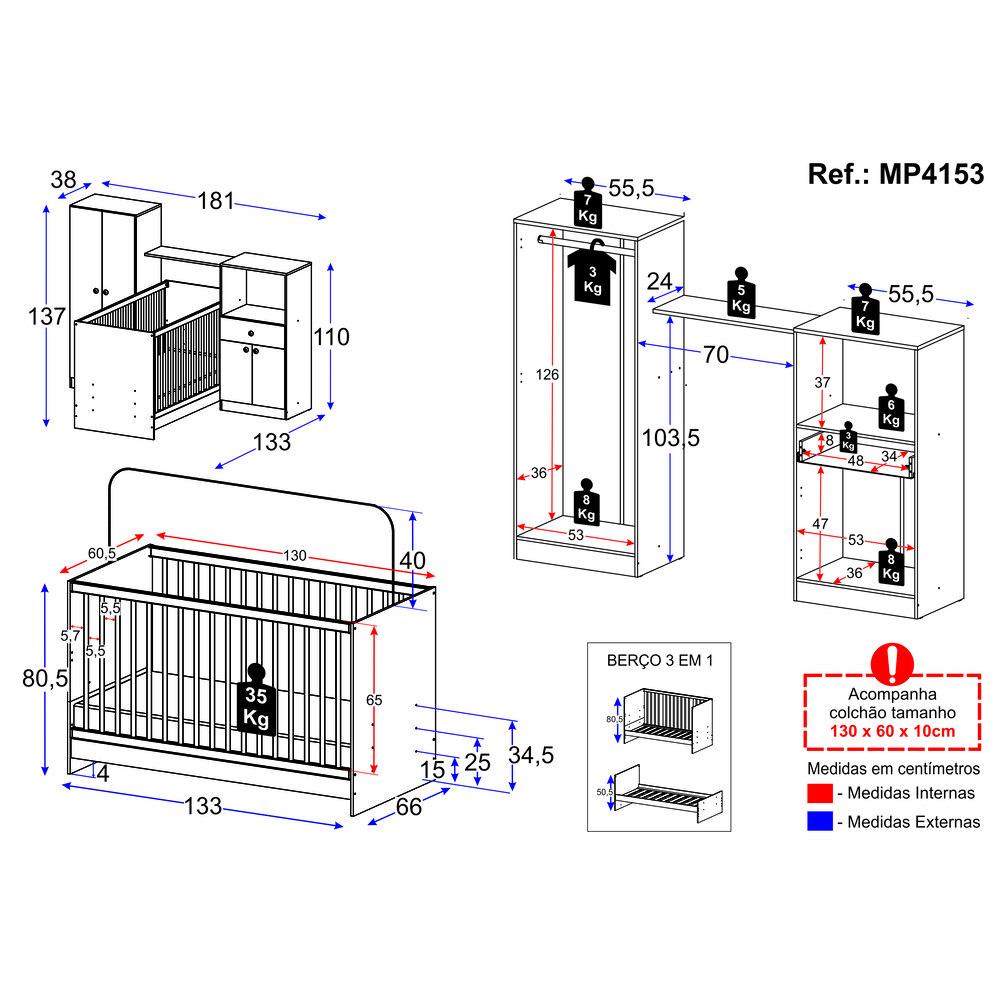 O Berço 3 em 1 com Colchão e Guarda-Roupas 4 Portas 1 Gaveta Multimóveis MP4153 é a escolha perfeita para quem busca um ambiente sofisticado e confortável para seu pequeno. Produzido em MDP com acabamento acetinado (cerca de 20% de brilho), garante durabilidade e resistência. O berço se transforma em sofá e minicama, acompanhando o crescimento do seu filho, possui 3 regulagens de altura para o colchão e acompanha suporte para mosquiteiro, garantindo noites mais tranquilas de sono para o bebê. As grades do berço são produzidas em MDF/madeira maciça de pinus. Berço certificado pelo INMETRO sob o selo n 000332/2025. Acompanha colchão (suporta até 50kg) em espuma revestido com tecido poliéster, que possui conforto macio e tratamento antiácaro e antialérgico. Estiloso e funcional, o guarda-roupa possui 4 portas e 1 gaveta com corrediças metálicas (oferecem leveza no manuseio), puxadores em ABS e prateleiras externas. Conteúdo da Embalagem: 1 (um) Berço 1 (um) Colchão 1 (um) Guarda-Roupa Kit Ferragem Manual de Montagem Dimensões do produto montado: Berço - Altura: 80,5cm | Largura: 133cm | Profundidade: 66cm Colchão - Altura: 10cm | Largura: 130cm | Profundidade: 60cm Guarda-Roupa - Altura: 137cm | Largura: 181cm | Profundidade: 38cm *Você pode consultar as medidas detalhadas na imagem técnica do produto. *As cores do produto podem sofrer variações de tonalidade de acordo com as configurações do seu dispositivo. Imagem meramente ilustrativa. Decoração não acompanha o produto. O produto será entregue desmontado e não disponibilizamos o serviço de montagem.