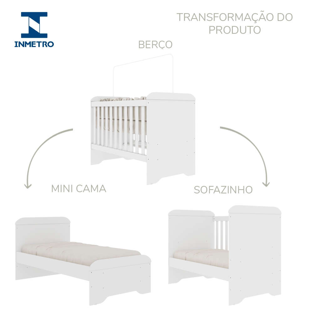 Berço 3 em 1 Americano, Mini Cama ou Sofazinho | MDF + Grades em PVC • Certificado INMETRO O Berço 3 em 1 Americano foi desenvolvido para oferecer máxima segurança, praticidade e conforto para o bebê. Fabricado em MDF com grades em PVC altamente resistentes, pintura atóxica e certificação INMETRO, este berço garante um ambiente tranquilo, seguro e durável para acompanhar todas as fases da criança. Com seu sistema 3 em 1, é possível utilizá-lo como berço, mini cama ou sofá infantil, facilitando a transição do bebê e prolongando a vida útil do produto. É a combinação ideal de economia, elegância e segurança. Destaques do Produto Berço 3 em 1: berço, mini cama ou sofazinho. Pintura UV atóxica com verniz foto curado — segura e livre de odores. Estrutura em MDF de alta qualidade. Grades em PVC reforçado — mais seguras e fáceis de limpar. Certificação INMETRO: Registro 012229/2023. Estrado regulável em 2 alturas para acompanhar o crescimento do bebê. Suporte para mosquiteiro incluso. Capacidade: suporta até 60 kg. Acabamento premium: cantos arredondados e design seguro. Medidas do Berço 133 cm (C) x 76 cm (L) x 100 cm (A) Estrado: MDF 6 mm com fixação reforçada Regulagem: 2 posições de altura Colchão Indicado: 130 x 70 x 10 ou 12 cm (colchão não incluso) Manutenção e Limpeza Limpeza simples com pano levemente umedecido. Informações Importantes A cor pode variar conforme a tela do celular ou monitor. Montagem por conta do cliente (manual incluso). Objetos decorativos não acompanham o produto. Produto enviado em embalagens reforçadas com proteção extra. Confira a embalagem no ato da entrega; em caso de avaria, recuse e registre. A entrega é até a portaria ou porta do endereço. Transportadoras não sobem escadas, elevadores ou acessam o interior da residência. Levar o produto até o local de montagem é responsabilidade do cliente. Garantia 3 meses contra defeitos de fabricação. Um berço completo, seguro, moderno e certificado — perfeito para acompanhar o bebê desde os primeiros dias até a fase de transição para a mini cama!