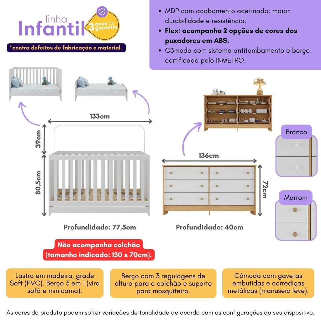 O Berço Americano 3 em 1 para Colchão 130x70cm com Cômoda Caramelo Multimóveis MP4677 é a solução perfeita para os pais que buscam funcionalidade, segurança e estilo no quarto do bebê. Versátil, o berço se transforma facilmente em minicama e sofá, acompanhando o crescimento da criança e garantindo momentos de diversão. Versatilidade e durabilidade: O conjunto é produzido em MDP (12/15mm) com acabamento acetinado (cerca de 20% de brilho), combinando beleza e resistência. Para tornar as noites de sono do pequeno tranquilas, o berço no padrão americano suporta até 35kg (50kg como minicama ou sofá). NÃO acompanha colchão (tamanho indicado: 130 x 70cm). Berço certificado pelo INMETRO sob o selo n° 0000085/2018. Proteção e segurança: Seu bebê merece o melhor! A grade Soft (PVC) é ecologicamente correta, com matéria-prima livre de metais pesados, atóxica e com proteção antiamarelamento. Para acompanhar todas as fases do bebê, o lastro em madeira conta com 3 regulagens de altura (16, 26 e 35,5cm). O sistema antitombamento da cômoda garante a máxima segurança dia e noite, enquanto o suporte para mosquiteiro do berço deixará o seu filho protegido contra insetos indesejados. Organização e estilo: A cômoda conta com 6 gavetas, que suportam até 3kg em cada, e corrediças metálicas, oferecendo suavidade no manuseio e bastante espaço para acomodar as roupinhas e acessórios. Suportando até 17kg, o seu tampo permite embelezar o quarto com itens decorativos, como abajur e brinquedinhos. Conteúdo da Embalagem: 1 (um) Berço 1 (uma) Cômoda Manual de Montagem Kit Ferragem Dimensões do Produto Montado: Berço - Altura: 80,5cm | Largura: 133cm | Profundidade: 77,5cm Cômoda - Altura: 72cm | Largura: 136cm | Profundidade: 40cm *Você pode consultar as medidas detalhadas na imagem técnica do produto. *As cores dos produtos podem sofrer variações de tonalidade de acordo com as configurações do seu dispositivo. *Obrigatório fixar a cômoda na parede. Aqui na Loja Multimóveis, você pode concluir sua compra facilmente com toda segurança. A entrega é garantida e você está em 1° lugar. Imagens meramente ilustrativas. Decoração não acompanha os produtos. Os produtos serão entregues desmontados e não disponibilizamos o serviço de montagem.