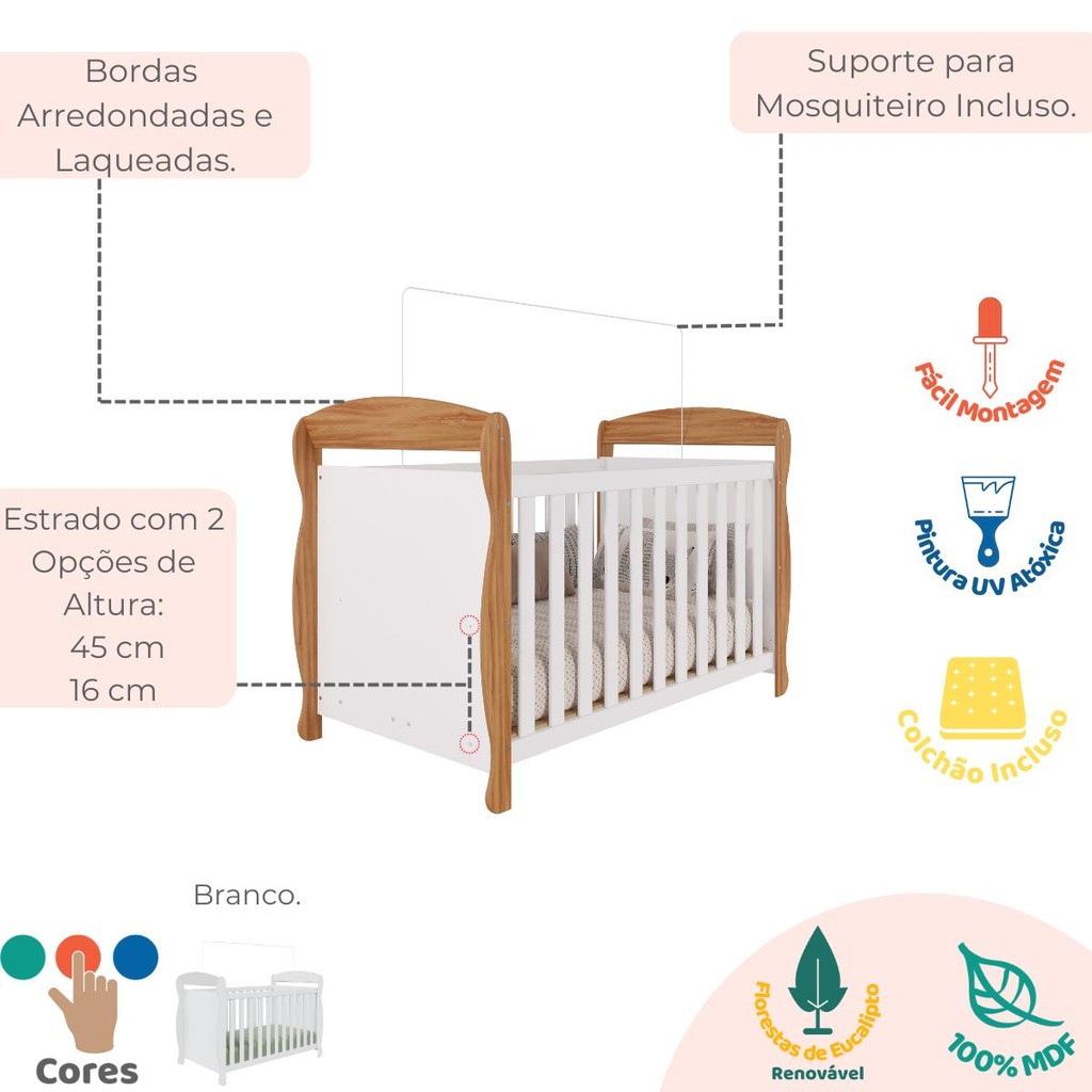 O Berço Marquesa, padrão americano, é ideal para quem busca segurança, conforto e praticidade no quarto do bebê. Produzido em 100% MDF e com pintura atóxica, oferece um ambiente seguro e acolhedor para o descanso dos pequenos. Possui varal para mosquiteiro incluso, garantindo noites mais tranquilas. Para acompanhar o crescimento do bebê, o estrado do colchão conta com 2 opções de altura, permitindo ajustes conforme a fase da criança. Além disso, o berço pode ser convertido em mini cama ou mini sofá, trazendo funcionalidade e aproveitamento por muito mais tempo. Como complemento, o Colchão Faura oferece o suporte ideal para um sono tranquilo. Com medidas de 70x130 x10cm, é confeccionado com espuma D18 de densidade média e revestido com poliéster resistente e fácil de limpar. Ficha técnica -Berço Marquesa -Dimensões do berço montado: Altura 99cm x Largura 148cm x Profundidade 78,4cm -Dimensões do colchão: Comprimento: 130cm x Altura 10cm x Largura 70cm -Manual de Montagem: Manual segue na embalagem do produto. - Os entregadores não estão autorizados a subir escadas ou elevadores, realizando a entrega apenas na recepção ou portaria, conforme as normas trabalhistas dos transportadores. Recomendamos que os clientes considerem essa limitação ao realizar suas compras. - Imagens meramente ilustrativas: a decoração não acompanham o produto. -Recomendações de Uso, Manutenção e Limpeza: Para limpeza utilize somente pano limpo e macio, ligeiramente umedecido em água, seguido de um pano seco. Perguntas Frequentes 1 - O berço Marquesa é fácil de montar? R - Sim. O manual é ilustrado e simples. Caso você entenda que não terá condições de realizar a montagem, recomendamos contratar um montador profissional na sua cidade. Nós não realizamos a montagem dos produtos e não oferecemos esse serviço. 2 - Posso comprar o berço ou o colchão separadamente? R - Sim, os produtos estão disponíveis individualmente no site. 3 - Qual a densidade da espuma? R - Espuma D18, ideal para bebês. 4 - O Colchão possui revestimento impermeável? R - Não. É poliéster, fácil de limpar. Recomendamos o uso de protetor. 5 - O Colchão Serve para qual berço? R - Para berços padrão americano com medidas compatíveis.
