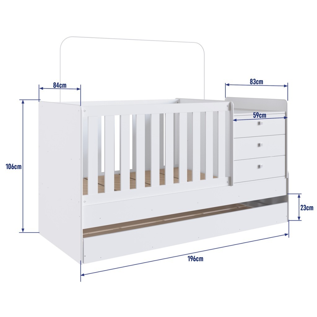 Dimensões: - Altura: 106,00 cm - Largura: 196,00 cm - Profundidade: 84,00 cm - Peso: 91,000 kg Descrição: O(a) Berço Cama com Auxiliar Bb690 Branco - Completa Móveis é produzido em MDP na escala de brilho Fosco, e possui um grau de dificuldade de montagem: Médio. Seu revestimento/acabamento é: Pintura BP. Infelizmente a Loja não oferece serviço de montagem, deixamos essa informação bem clara em todas as nossas páginas de produto. Onde especificamos que os móveis chegarão desmontados, e que a montagem fica por conta do cliente. Como não oferecemos esse serviço não embutimos o mesmo no preço dos produtos, ou seja, maior economia para você! Todos os nossos móveis também acompanham o manual de montagem, e caso você queira, pode realizar a montagem você mesmo, sempre especificamos os graus de montagem dos produtos. Nos casos de grau baixo e médio, com pouco ou nenhum conhecimento, você mesmo pode efetuar a montagem, e fazer essa economia. Apenas nos graus de montagem alto, recomendamos a contratação de um montador com experiência, visto que são montagens mais complicadas. A montagem é feita com Parafusos, cavilhas, pregos e buchas. Este móvel é indicado para que seja utilizado no(a) Quarto Bebê, dando um toque especial no cômodo de sua casa. Para que você mantenha seu produto sempre em ótimo estado, recomendamos que use apenas um pano seco ou levemente umedecido, sem o uso de quaisquer produtos abrasivos. A Loja garante aos clientes, 90 dias de garantia nos produtos, porém, recomendamos que entre em contato com o fornecedor/marca do produto, pois o mesmo(a), pode garantir um prazo maior de garantia. Lembrando ainda que: quaisquer objetos decorativos que aparecem nas imagens, não acompanham o produto. Características: - Possui Gavetas?: Não - Possui Portas?: Não - Possui Espelho?: Não - Possui Prateleiras?: Não - Possui Puxadores?: Não - É frágil?: Sim - Material da Estrutura: MDP - Escala de Brilho: Fosco - Portátil: Não - Possui Rodízios?: Não - Possui Sapatas?: Não - Possui Pés?: Não - Pés com regulagem de altura?: Não - Acompanha Colchão: Não - Armação Mosquiteiro: Sim - Certificação Inmetro: Sim - Colchão Indicado: 70 x 130 cm - Grades Com Regulagem de Altura: Sim - Idade recomendada: 0 a 15 anos - Vira Cama: Sim - Possui espelho?: Não - Como os Móveis Chegarão na Minha Casa: Desmontados, em caixas, acompanhados de todas as peças, ferragens e manuais para montagem - Grau de Dificuldade da Montagem: Médio - Necessita de Montagem: Sim - Sistema de Montagem: Parafusos, cavilhas, pregos e buchas - Garantia (dias): 90 - Indicação de Uso: Quarto Bebê - Observação: Quando em forma de cama, a medida ideal para colchão é 188 x 78 cm. Objetos decorativos que aparecem nas imagens não acompanham o produto - Recomendação de Manutenção: Pano seco ou umedecido, não utilizar quaisquer produtos abrasivos - Revestimento /Acabamento: Pintura BP