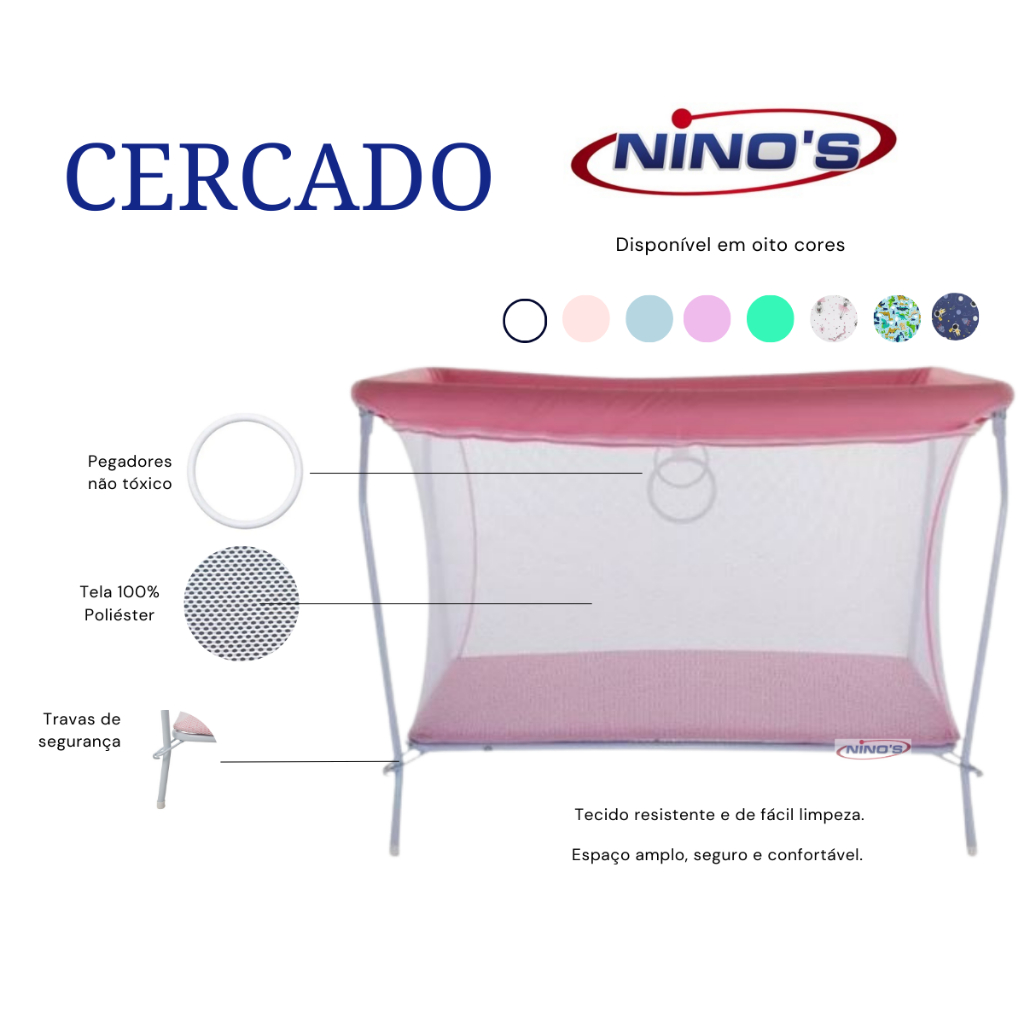 Cercado Ninos - Chiqueirinho Desmontável Apresentamos o Cercado Ninos, um produto versátil, seguro e confortável, projetado para proporcionar momentos de diversão e proteção para o seu pequeno. Características Principais: Dimensões: 76 cm (altura) x 76 cm (largura) x 98 cm (profundidade). Idade Recomendada: Para crianças de até 2 anos. Capacidade Máxima: Suporta até 15 kg. Benefícios do Produto: Estrutura Resistente: Feito em aço tubular com pintura epóxi para maior durabilidade. Segurança Extra: Bordas superiores espumadas e revestidas em courino macio, anti-chama e resistente. Base antiderrapante, garantindo estabilidade durante o uso. Conforto: Fundo acolchoado, perfeito para o descanso e as brincadeiras da criança. Praticidade: Desmontável, fácil de montar e dobrar. Compacto e leve, ideal para transporte e armazenamento. O Cercado Ninos é a escolha ideal para pais que buscam qualidade, segurança e praticidade no dia a dia. Adquira o seu e garanta momentos únicos de conforto e diversão para o seu filho! Aviso! Direitos Autorais Todo o conteúdo deste anúncio (incluindo texto, imagens e vídeos) é protegido por Leis de Direitos Autorais. Nenhuma parte pode ser reproduzida, distribuída, modificada ou utilizada para fins comerciais sem a permissão prévia e por escrito do titular dos direitos autorais Ninos. Uso não autorizado está sujeito a penalidades previstas na legislação vigente.