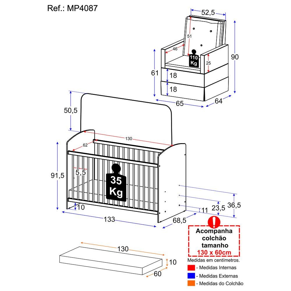 O Berço com Colchão e Poltrona de Amamentação Olaf Multimóveis MP4087 foi criado para complementar o quartinho, facilitando a vida da mamãe nos preparativos para a chegada do bebê. O berço é padrão nacional (tamanho do colchão 130cm x 60cm), produzido 100% em MDP (suporta 30kg) com acabamento em pintura UV, que garante maior durabilidade e facilidade na limpeza. O lastro possui 3 regulagens de altura para o colchão e acompanha suporte para mosquiteiro, que garante noites mais tranquilas de sono. Berço certificado pelo INMETRO sob o Selo n° 001073/2017. O Colchão D18 (suporta 50kg), que acompanha o berço, é produzido 100% em tecido poliéster com preenchimento em espuma. Possui tratamento anti-ácaro e anti-alérgico e é indicado para crianças de até 3 anos. A poltrona de amamentação é produzida em madeira de eucalipto, com revestimento em tecido veludo, molas reforçadas e mecanismo de balanço, proporcionando muito aconchego. Capaz de suportar 110kg, o assento possui densidade D23, que garante maior conforto e durabilidade. Conteúdo da Embalagem: 1 (um) Berço 1 (um) Colchão 1 (uma) Poltrona Kit Ferragem Manual de Montagem Dimensões do produto montado: Berço - Altura: 91,5cm | Largura: 133cm | Profundidade: 68,5cm Colchão - Altura: 10cm | Largura: 130cm | Profundidade: 60cm Poltrona - Altura: 90cm | Largura: 65cm | Profundidade: 64cm *Você pode consultar as medidas detalhadas na imagem técnica do produto. *As cores do produto podem sofrer variações de tonalidade de acordo com as configurações do seu dispositivo. Imagem meramente ilustrativa. Decoração não acompanha o produto. O produto será entregue desmontado e não disponibilizamos o serviço de montagem.