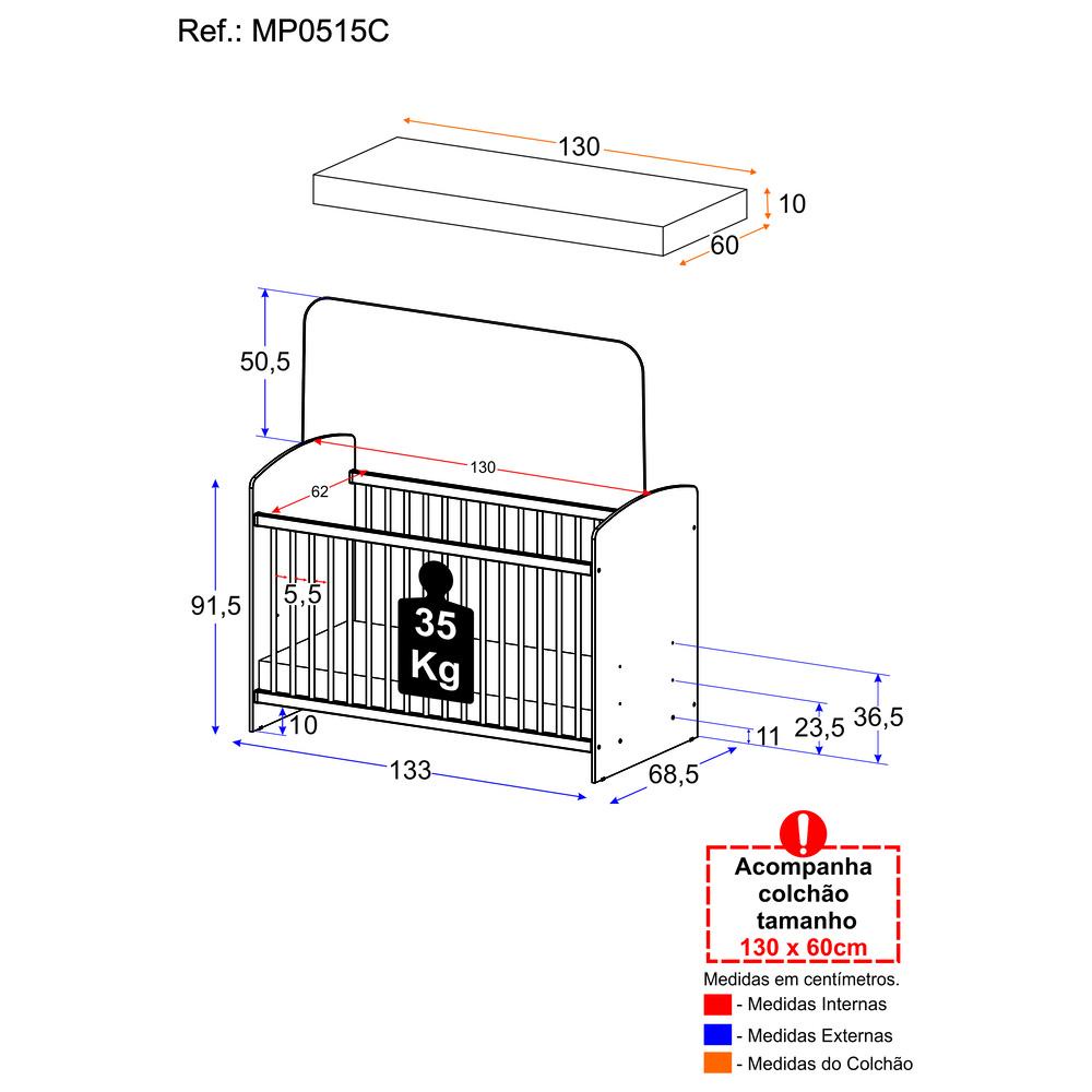 O Berço com Colchão Incluso Ana Lívia Multimóveis MP0515C é produzido em MDP, que garante maior durabilidade e resistência, e possui acabamento acetinado (cerca de 20% de brilho). O berço é padrão nacional (tamanho do colchão 1,30 x 0,60), possui grade fixa, 3 regulagens de altura para o colchão e acompanha suporte para mosquiteiro, que garante noites mais tranquilas de sono para o bebê. O colchão possui estrutura em espuma e tecido poliéster. De conforto macio, possui tratamento anti-ácaro e anti-alérgico e é indicado para até 50kg. Berço certificado pelo INMETRO sob o Selo n° 001073/2017. Conteúdo da Embalagem: 1 (um) berço 1 (um) colchão Dimensões do produto montado: Berço - Altura: 91,5cm | Largura: 68,5cm | Profundidade: 133cm Colchão - Altura: 10cm | Largura: 60cm | Profundidade: 130cm *Você pode consultar as medidas internas na imagem técnica do produto. *As cores do produto podem sofrer variações de tonalidade de acordo com as configurações do seu dispositivo. Imagem meramente ilustrativa. Decoração não acompanha o produto. O produto será entregue desmontado e não disponibilizamos o serviço de montagem.