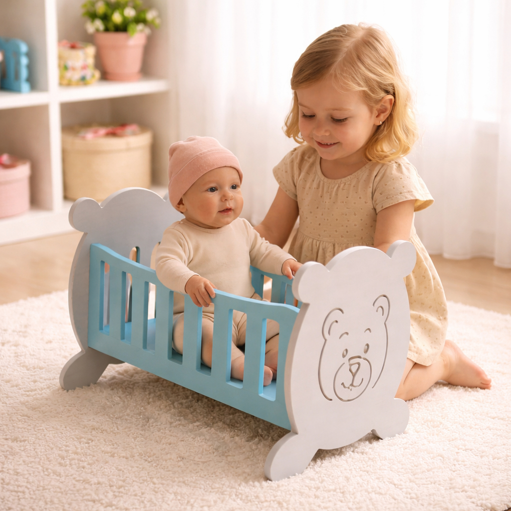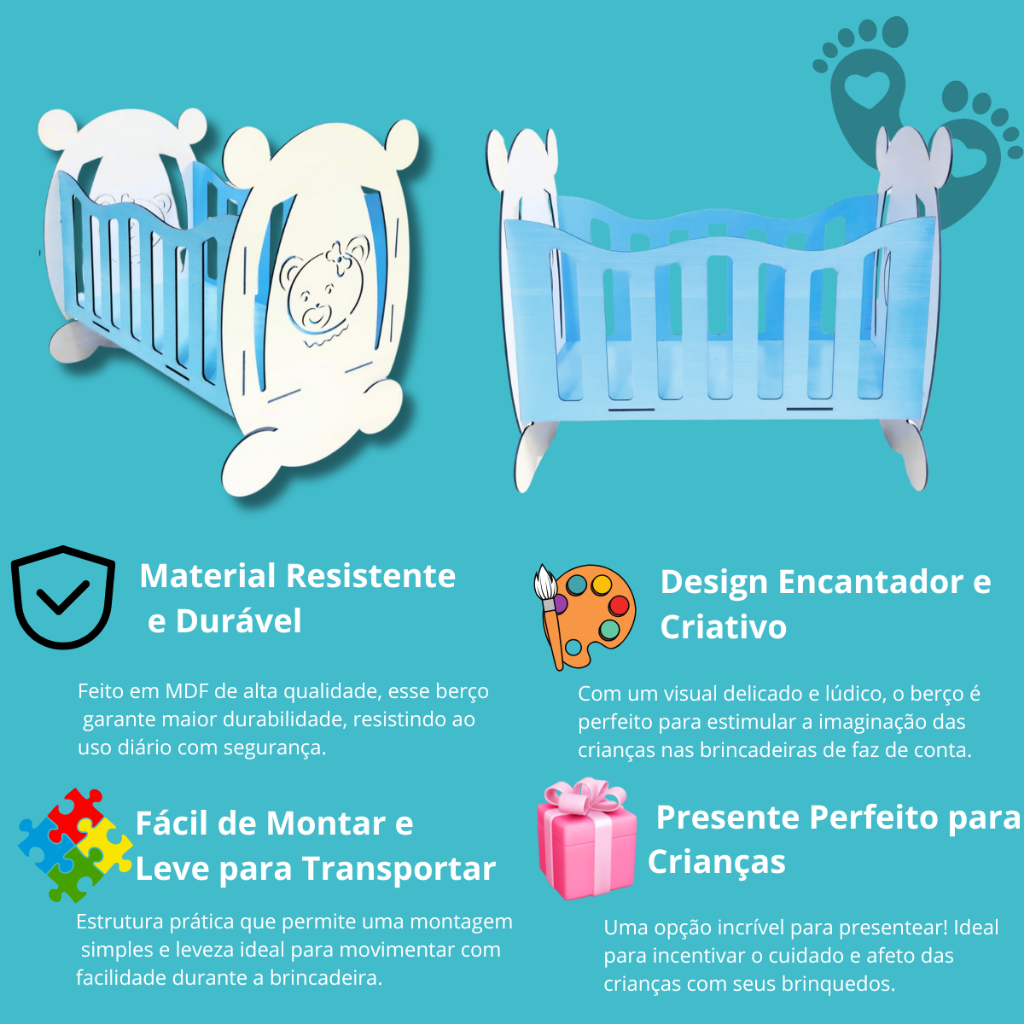 Berço Infantil de Brinquedo em MDF – Decoração e Diversão no Quarto das Crianças Transforme o cantinho infantil com este berço de brinquedo em MDF, criado para deixar a brincadeira ainda mais divertida e o ambiente muito mais encantador. Ele é perfeito para acompanhar o universo lúdico das crianças, permitindo que brinquem de cuidar das bonecas enquanto decora com delicadeza. Produzido em MDF de alta qualidade, o berço é leve, resistente e possui acabamento impecável com recortes suaves e bem definidos. Os detalhes em formato de ursinho nas laterais deixam a peça ainda mais charmosa e acolhedora. Características do Produto: • Disponível nas cores: azul e rosa. • Material: MDF de alta qualidade • Acabamento: corte a laser e pintura especial • Detalhe decorativo: ursinho nas laterais • Montagem por encaixe, sem ferramentas • Idade recomendada: acima de 3 anos (uso supervisionado) Dimensões: • Altura: 40 cm • Largura: 30 cm • Comprimento: 44,5 cm • Espessura das peças: 3 mm Benefícios: • Estimula o faz de conta e a criatividade • Ideal para brincar de cuidar das bonecas • Decora quartos infantis, brinquedotecas e festas temáticas • Estrutura leve, resistente e segura • Montagem rápida e prática Conteúdo da Embalagem: • 01 berço infantil de brinquedo em MDF (enviado desmontado, fácil de montar) Perfeito para unir decoração, diversão e imaginação em um único produto. Casa Bebe Decor