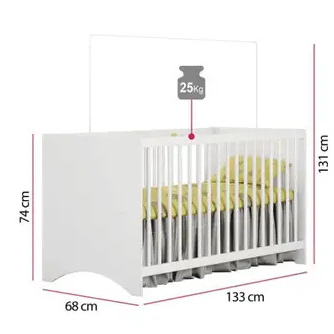 O Berço Gutti é a escolha ideal para os primeiros meses do seu bebê, proporcionando conforto e segurança. Com dimensões de 133 cm de largura, 68 cm de comprimento e 80 cm de altura, ele se adapta perfeitamente a qualquer ambiente, garantindo um espaço aconchegante para o descanso do seu pequeno. Fabricado em MDP, este berço é robusto e durável, suportando até 25 kg. Essencial para o sono saudável do bebê, enquanto o design compacto facilita a colocação em diferentes cômodos da casa. Recomendado para bebês de 0 a 24 meses, o Berço GUTTI oferece um ambiente seguro e acolhedor, permitindo que os pais fiquem tranquilos enquanto o bebê dorme. Seu modelo não é desmontável nem dobrável, garantindo estabilidade e segurança durante o uso. Escolher o Berço GUTTI é optar por qualidade e praticidade, proporcionando ao seu bebê um espaço ideal para descansar e sonhar. Invista no bem-estar do seu pequeno com um produto que une funcionalidade e conforto. Varão de mosquiteiro (removível) Para colchão 60x130 - NÃO INCLUSO - Temos para venda o colchão. Acompanha: Rodinhas (2 c/ trava e 2 s/ trava) Instrução de montagem - recomendável uso de chave manual. MEDIDAS do produto montado: ALTURA: 80 CM LARGURA: 133 CM COMPRIMENTO: 68 CM PESO:19,6 QUILOGRAMA MATERIAL: Cabeceiras em MDP Modelo da grade: FIXA Possui regulagem de altura no estrado, tendo 2 opção de montagem 47 cm; 67cm; Montagem por conta do cliente. Recomendável o uso até 24 meses de vida do bebê. Suporta 25KG. Só enviamos 1 unidade por compra = 01 berço com suporte de Mosqueteiro + Rodinhas * Para limpeza use um pano macio seco ou ligeiramente humedecido com água e depois um pano seco. Não use agentes de limpeza ou abrasivos. Observações importantes: - A tonalidade da cor do produto pode variar de acordo com a sua tela, a iluminação do ambiente ou sua percepção visual. - Lembrando que são fotos ilustrativas tratadas em estúdios podendo haver pequena diferença nas cores. - A montagem será de responsabilidade do comprador; - Não nos responsabilizamos, no ato da entrega, por subir escadas/elevadores ou transporte por guincho em apartamentos. Eventuais despesas são de responsabilidade do comprador; - Confira as dimensões deste produto e certifique-se de que passará normalmente por supostos elevadores, portas, escadas e/ou corredores de sua residência; - Não receber produto com avaria na embalagem, verifique o produto no ato da entrega, caso esteja avariado, recuse no ato. - Os produtos avariados pelo transporte, só serão trocados mediante a observação em nota fiscal no momento da entrega.