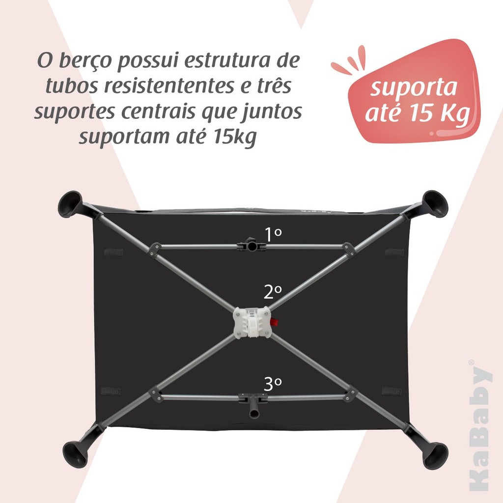 O Berço infantil Adventure é uma peça versátil e segura, projetada para proporcionar conforto e proteção ao bebê durante o descanso e brincadeiras, ele é composto por uma estrutura robusta e com acabamento de alta qualidade garantindo durabilidade e segurança, o design é único, permitindo ventilação adequada e a supervisão contínua do bebê as laterais são acolchoadas com tecido macio, ideal para evitar machucados em caso de contato direto, o Berço Adventure da KaBaby se adapta às diferentes fases de crescimento da criança, a base é revestida com um colchão confortável e firme, essencial para o suporte adequado da coluna do bebê, para maior praticidade, além disso, o Berço Adventure da KaBaby é dobrável e acompanha bolsa que auxilia no transporte, permitindo fácil armazenamento, sendo ideal para pais que desejam levar conforto e segurança para viagens. IMPORTANTE: Produto com contém laterais ventiladas, que auxiliam na circulação do ar. Acompanha: 1 - Berço Adventure KaBaby Cinza 1 - Mosquiteiro 1 - Bolsa Para Transporte Dimensões: 75cm x 72cm x 102cm Peso Recomendado até: 15kg Idade Recomendado: A partir de 0 anos Segurança Garantida: Estrutura resistente e materiais atóxicos garantem a proteção do bebê, com grades laterais que impedem quedas e facilitam a supervisão. Conforto para o Bebê: Base acolchoada e estável proporciona um ambiente confortável e saudável para o descanso. Praticidade: Modelo dobrável e portátil, permite fácil transporte e armazenamento, ideal para viagens ou casas com espaço limitado. Estética Versátil: Design moderno e clean combina com qualquer estilo de decoração, tornando-o um item funcional e decorativo. Durabilidade: Materiais de qualidade garantem resistência ao uso contínuo, sendo uma solução confiável ao longo das diferentes fases do bebê. Higiene e Facilidade de Limpeza: Componentes revestidos com tecidos fáceis de limpar, mantêm o berço sempre em boas condições. APROVADO PELO INMETRO / REGISTRO: 007495/2025