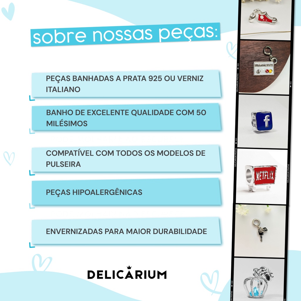 🐶 CONTE SUA HISTÓRIA COM SEUS BERLOQUES ✈ ✅ Peças Hipoalergênicas ✅ Banhadas a prata 925 com revestimento premium de 50 milésimos ✅ Envernizada para maior durabilidade ✅ Compatível em todos modelos de pulseiras 🏪 VISITE NOSSA LOJA PARA VER MAIS MODELOS DE BERLOQUES 📑 CARACTERÍSTICAS: ▪ Medidas do Aproximadas: 1,5 cm x 1 cm ▪ Peso aproximado: 5 g ▪ Tipo de banho: Prata 925 (50 milésimos) ▪ Camada de verniz para maior durabilidade ✅ GARANTIA: • oferecemos garantia de 30 dias contra qualquer defeito de fabricação ou anomalias verificadas no material. ❤ CUIDADOS COM SEU BERLOQUE: ▪ Evite usar seu berloque quando for tomar banho de chuveiro ou piscina. ▪ Não os utilise quando for praticar esportes de alto impacto ou que provoquem suor. Algumas pessoas têm um alto índice de ácido úrico no suor que podem danificar a peça. ▪ Evite contato da peça com produtos de limpeza, pois podem causar manchas. ▪ Para a limpeza utilize apenas uma flanela seca ou flanela mágica para bijuterias. ❔ DÚVIDAS? • mande pra gente no chat 😉 • nosso horário de atendimento é das 8h às 20h ____❤ DELICARIUM ____❤ mais de 20.000 clientes safisfeitos ____❤ confira nossas avaliações