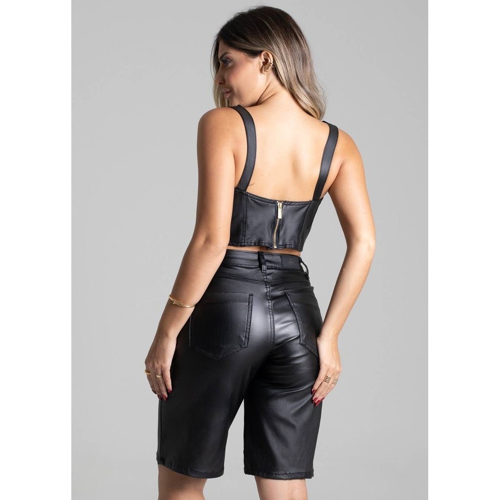 Bermuda confeccionado em bengaline. Modelagem moderna e confortável para todas as ocasiões. Cintura alta Possui aplicação de strass Fechamento com botão e zíper Bolsos frontais e posterior funcionais Barra simples Tecido: Bengaline Tipo de lavagem: Color Cor: Preto