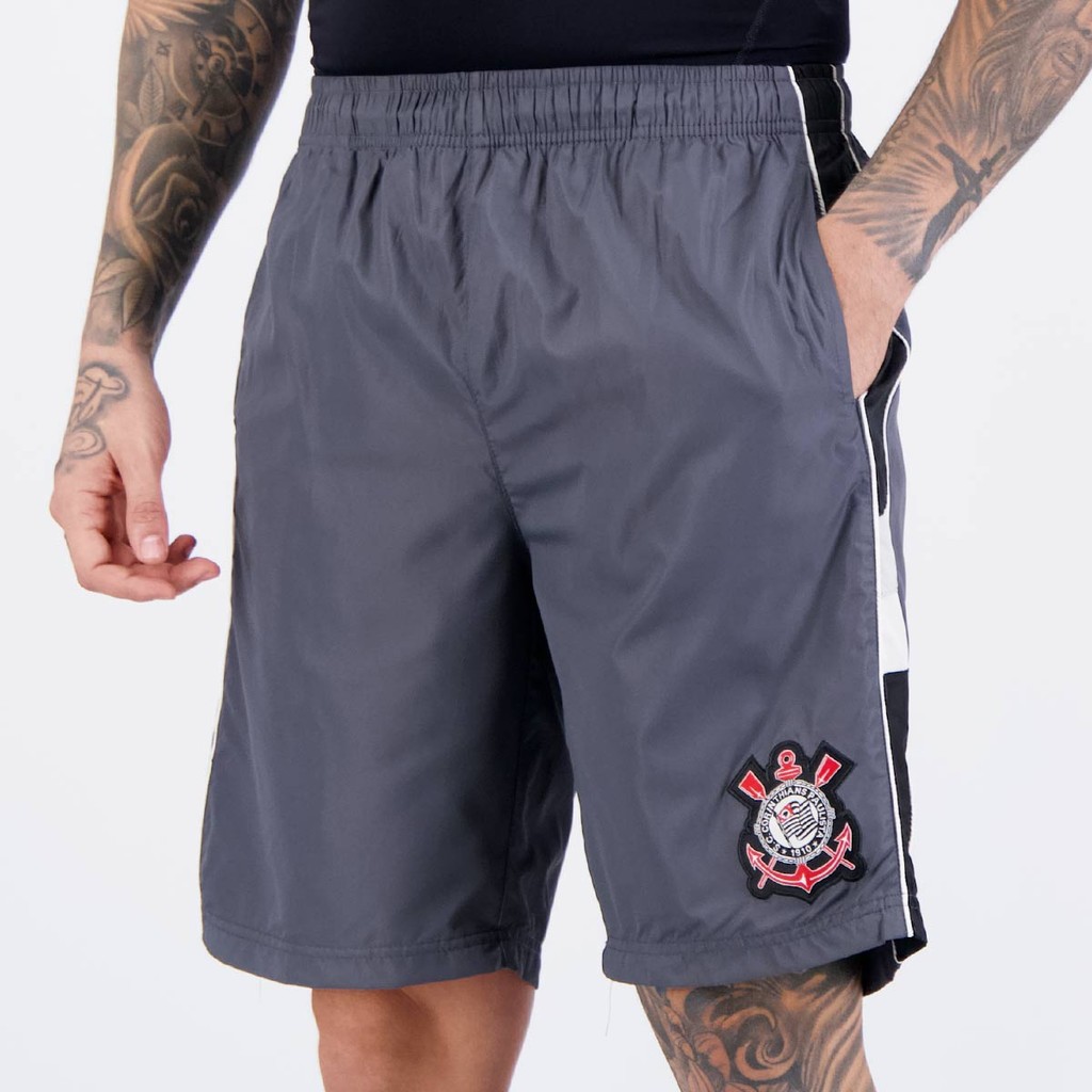 Composição corpo: 100% Poliéster Composição forro: 100% Poliéster Bolsos: Dois frontais, sem zíper Ajuste: Elástico e cordão Cor predominante: Cinza Indicado para: Casual Clube: Corinthians Gênero: Masculino Origem: Importada Escudo: Bordado Dimensões aproximadas (A x L): P: 52 x 36 cm M: 54 x 38 cm G: 56 x 40 cm GG: 58 x 42 cm EG: 60 x 44 cm