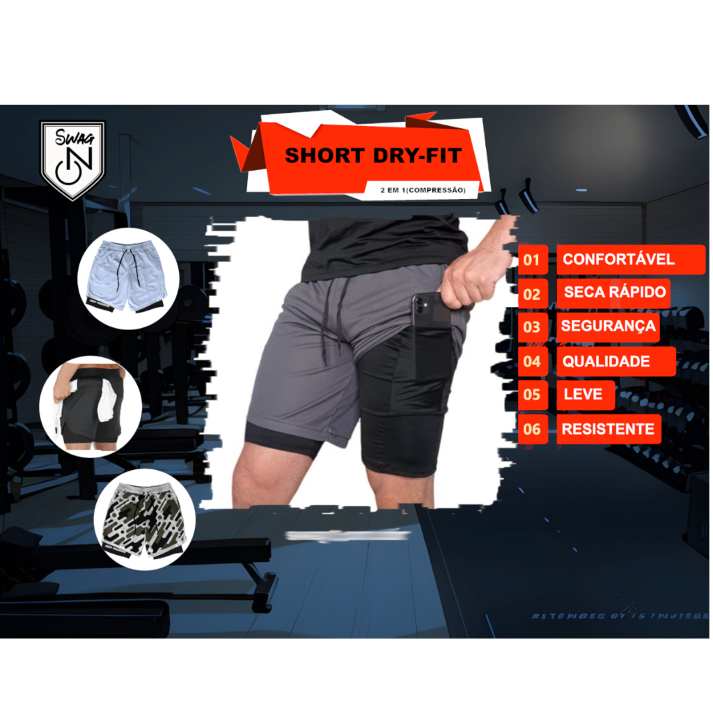 Bermuda Dry Fit Compressão 2 em 1 Academia Militar Bolso Interno Para Celular