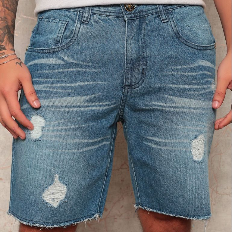 Bermuda Jeans Masculina Original,Rasgada Destroi Puidos e Bigode no Laser Tudo de Mais Moderno da Moda Masculina