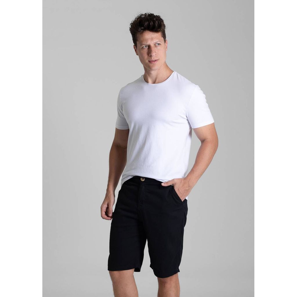 Bermuda masculino confeccionada em linho. Modelagem diversas e comprimento médio. Cintura média Comprimento médio Fechamento com botão e zíper Bolsos frontais e e traseiros funcionais Barra simples Modelagem: Men bermuda Tecido: linho Cor: preta Composição: 40% ALGODÃO 28%VISCOSE 20%LIOCEL 12%LINHO