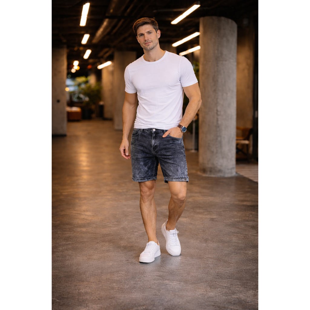 Bermuda Masculina Jeans Elastano Preta Manchada Premium Moderna Estilosa Faded Despojada Qualidade Conforto Tendência