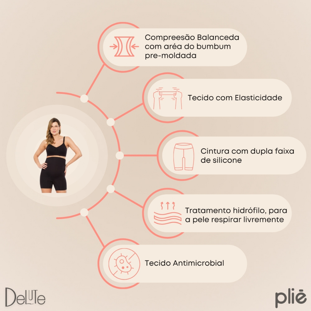 Bermuda Maternity Alta Para Gestante Plié Ref. 50042 Conforto total para sua gestação, sem atrito e com sustentação! Essa bermuda é ideal para gestantes que buscam aliviar o peso da barriga, evitar o atrito entre as pernas e manter a postura com conforto. O tecido suave e elástico acompanha cada fase da gravidez, enquanto a compressão leve oferece suporte sem apertar. Sustentação graduada ao redor da barriga Cintura alta e cós largo Área do bumbum pré-moldada Acabamento macio nas cavas Sem costuras laterais e com fundinho 100% algodão Tratamento hidrófilo: pele livre para respirar Composição: 85% Poliamida. 10% Elastano. 5% Algodão. Tamanhos: P ao GG | Cores disponíveis sob consulta Para viver sua gestação com liberdade. Adquira já a sua!