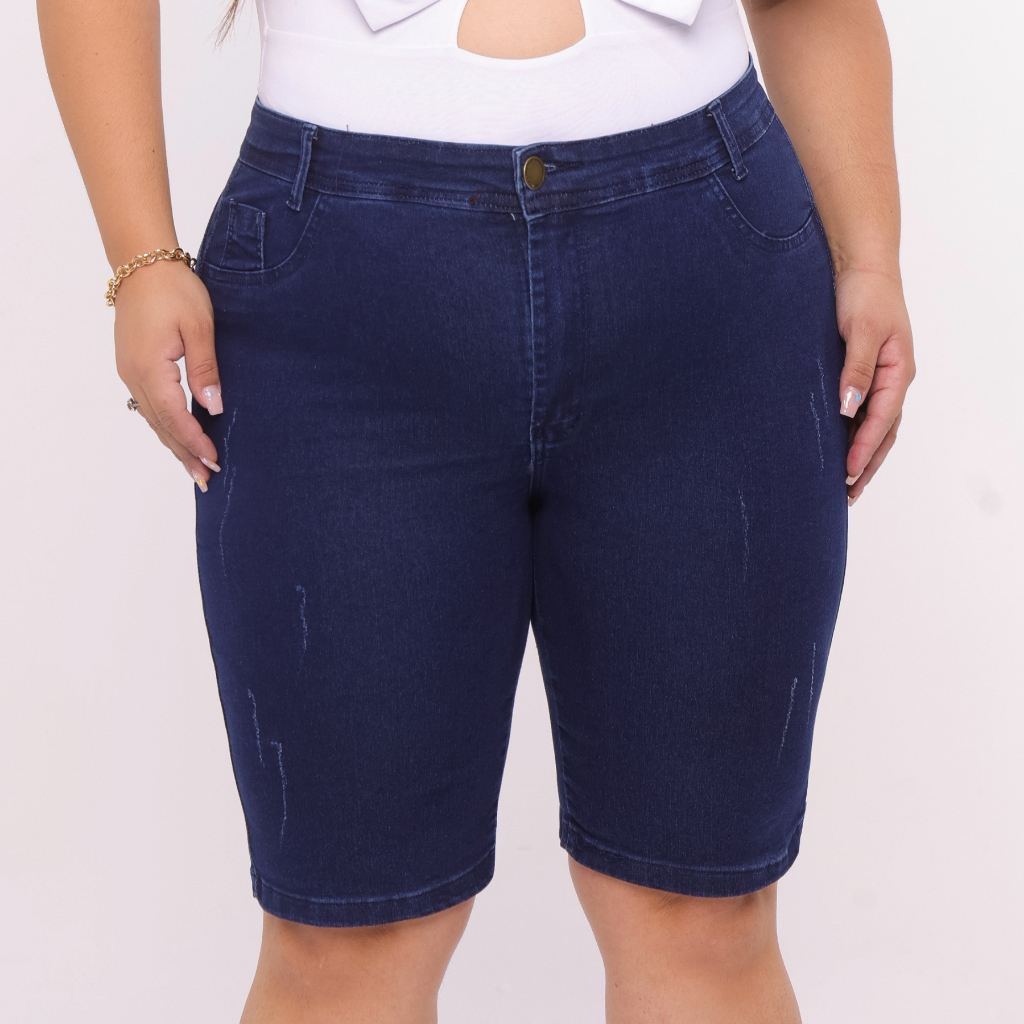 Bermuda Short Jeans Feminina Plus Size Ciclista Jump At Joelho Cintura Alta com Lycra Levanta Bumbum