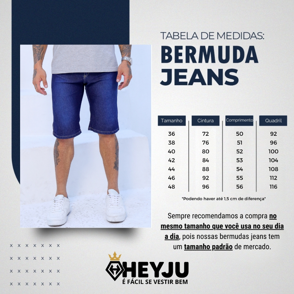 BERMUDA JEANS A bermuda jeans masculina é a escolha perfeita para quem busca estilo e conforto nos dias mais quentes. Com um design moderno e casual, ela pode ser usada em diversas ocasiões, desde um passeio no parque até um happy hour com os amigos. Além disso, o tecido jeans é resistente e durável, garantindo um ótimo custo-benefício. Benefícios do produto: Estilo e conforto para os dias quentes; Design moderno e casual; Tecido jeans resistente e durável; >>> 2 bolsos frontais e 2 bolsos traseiros; >>> Costura reforçada; >>> Botões de ferro e zíper reforçado; Garantia: Oferecemos garantia de qualidade em nossos produtos. Caso não fique satisfeito com a sua bermuda jeans masculina, aceitamos devolução em até 30 dias após a entrega. Prazo de entrega: O prazo de entrega varia de acordo com a região e a forma de envio escolhida. Ao inserir o CEP no carrinho de compras, o prazo estimado será informado. Dúvidas frequentes: -Produto acompanha nota fiscal? Sim, todos nossos produtos acompanham nota fiscal. - Tem a pronta entrega? Sim, todos os produtos anunciados estão disponíveis para envio imediato. - O produto é novo? Sim, todos os produtos são novos, Somos a loja da marca Heyju. Ainda precisa de ajuda? Utilize o campo de perguntas e esclareça suas dúvidas diretamente com um de nossos atendentes. Quem somos? Desde 1978, produzimos roupas para grandes marcas brasileiras. Em 2015, lançamos a Heyju e começamos a desenvolver nossas próprias peças, sempre com carinho e dedicação. O sucesso nas lojas físicas nos levou a expandir para o comércio online em 2017, conquistando destaque nos principais marketplaces do país. Na Heyju, temos prazer em proporcionar a todos o direito de se vestir bem. Bem-vindos à Heyju, onde a moda encontra a paixão pelo estilo!