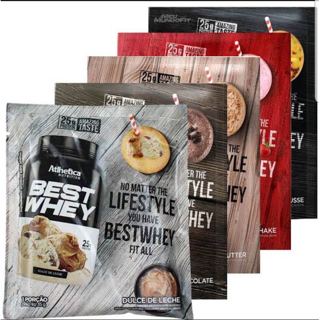 Anúncio referente a 1 unidade de 40g. Best Whey da Atlhetica é um suplemento de Whey Protein Gourmet, composto por Whey Protein Concentrada, Isolada e Hidrolisada que tem como grande diferencial o sabor e a cremosidade sendo uma excelente opção pra quem valoriza, além da qualidade nutricional; o sabor na hora de consumir seu suplemento proteico. Existem diversas opções de sabores de Best Whey; entre elas Mousse de Maracujá, Doce de Leite, Chocolate Brownie, Pasta de Amendoim, Cookies & Cream e outros que oferecem 25 gramas de proteínas de alto valor biológico com baixos índices de carboidrato e gordura.