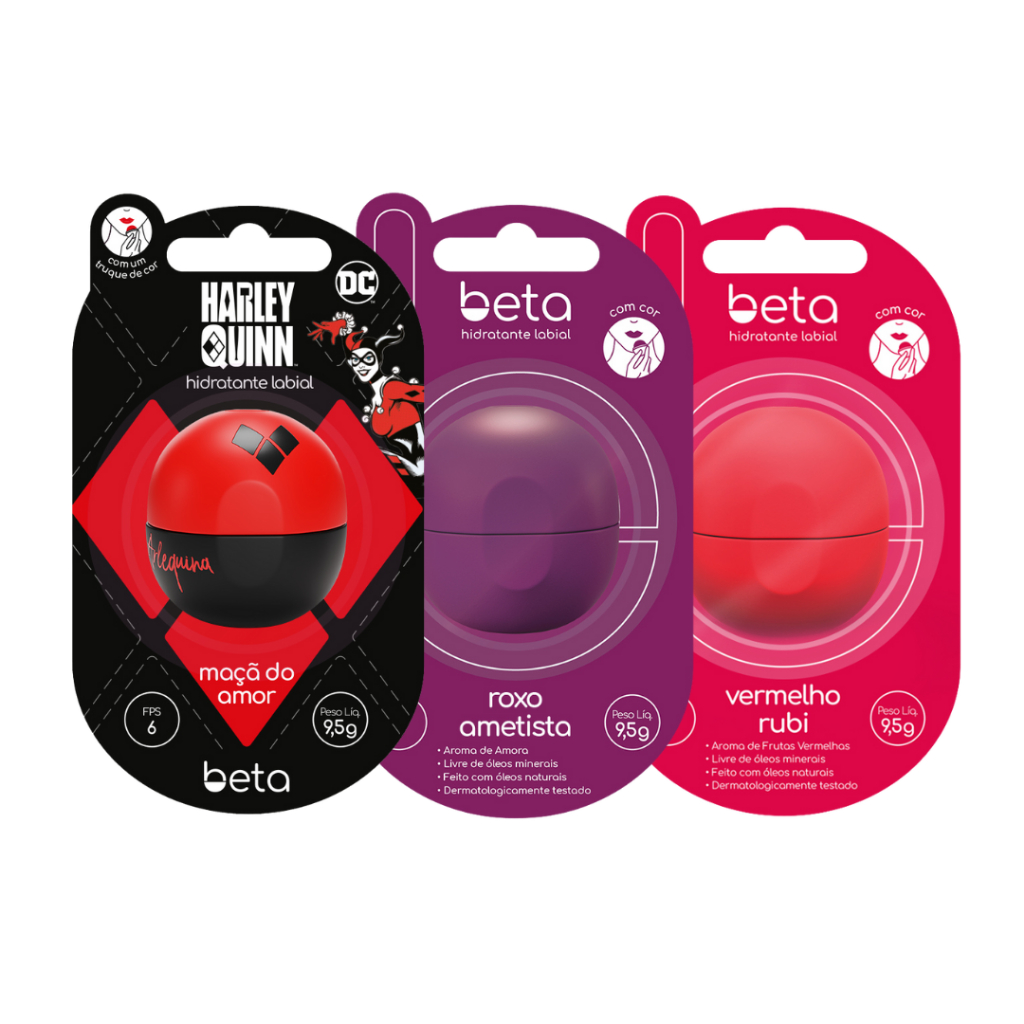 Desperte seu lado único com o Kit de Hidratantes Labiais Beta, composto por três edições exclusivas que combinam cores vibrantes, aromas irresistíveis e hidratação intensa. Este kit inclui: 1 - Hidratante Labial Beta Arlequina Maçã do Amor (9,5g) - Inspirado na icônica personagem dos quadrinhos e cinema, Beta Arlequina traz o aroma irresistível de maçã do amor e um tom deslumbrante de vermelho. Além de hidratar profundamente, oferece proteção solar (FPS 6) e um design colecionável. 1 - Hidratante Labial Beta Amora Roxo Ametista (9,5g) - Com um aroma delicioso de amora, Beta Roxo Ametista adiciona um toque de cor roxa vibrante aos seus lábios. Perfeito para realçar qualquer look, ele oferece hidratação profunda, brilho natural e proteção solar (FPS 6). 1 - Hidratante Labial Beta Frutas Vermelhas Vermelho Rubi (9,5g) - Com aroma frutado e um tom sofisticado de vermelho rubi, este hidratante labial é uma verdadeira joia. Hidrata profundamente, protege (FPS 6) e é ideal para quem busca um toque de cor e cuidado. Benefícios do Kit: - Hidratação intensa e prolongada - Proteção solar (FPS 6) - Cores vibrantes: vermelho, roxo e rubi - Aromas irresistíveis de maçã do amor, amora e frutas vermelhas - Fórmula premium com óleos naturais de alta qualidade - Design exclusivo e ergonômico - Não testado em animais (Cruelty-Free) Modo de Usar: Aplique nos lábios e no contorno sempre que necessário. Ideal para todos os tipos de lábios, proporcionando cuidado e estilo em qualquer ocasião. Importante: Em caso de ingestão ou irritação, suspenda o uso e consulte um especialista. Mantenha em local seco e arejado, fora do alcance de crianças. Garanta o seu kit e transforme sua rotina de beleza com o cuidado e estilo dos Hidratantes Labiais Beta!