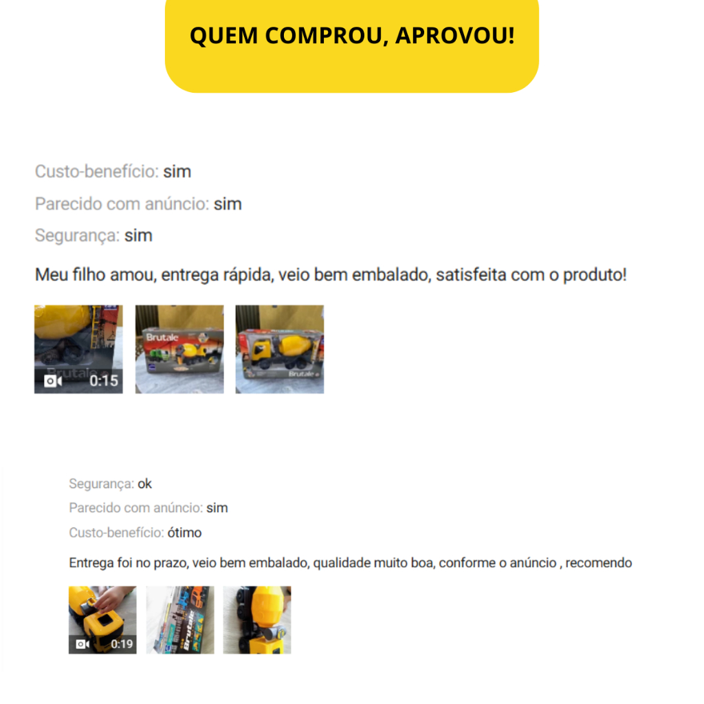 Olá! Ficamos muito contentes pela sua visita. Betoneira, com acabamento perfeito, feito de plástico resistente. Ideal para crianças a partir de 4 anos. DETALHES DO BRINQUEDO : => Modelo: Brutale Betoneira 1535 => Cor: Amarelo => Acabamento moderno e elegante. FUNÇÕES: => Gira o tambor com manivela, simulando mistura de concreto. => Despeja o conteúdo ao inclinar o tambor. => Rodas livres para brincar de empurrar e transportar. => Design realista e resistente, ideal para brincadeiras de obra. TABELA DE MEDIDAS : => Comprimento: 34 cm. => Largura: 12 cm. => Altura: 16 cm. É um brinquedo ideal para estimular a criatividade e a imaginação das crianças. Tenho certeza de que a qualidade vai te surpreender. Aguardo ansiosamente sua compra para embalar esse pedido com todo nosso amor, carinho e zelo! E é claro, não esqueça de deixar sua avaliação e seu comentário no anúncio, assim você ajuda outras pessoas também! Qualquer dúvida, estou à disposição no Chat para lhe atender da melhor maneira! Obrigado por confiar em nossa loja! =)
