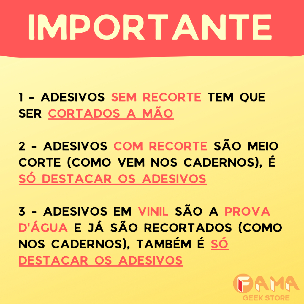 Linda cartela de adesivos para você colar onde quiser! ESPECIFICAÇÕES TÉCNICAS: - Tamanho dos adesivos: entre 3cm e 5cm - Impressão em Papel adesivo fotográfico - Ou Vinil Imprimível (a prova d'água) - Quantidade: de 10 a 15 adesivos por cartela - Cartela A5 ATENÇÃO¹: ADESIVOS SEM RECORTE TEM QUE SER CORTADOS A MÃO ATENÇÃO²: ADESIVOS COM RECORTE SÃO MEIO CORTE (COMO VEM NOS CADERNOS), É SÓ DESTACAR OS ADESIVOS ATENÇÃO³: ADESIVOS EM VINIL SÃO A PROVA D'ÁGUA E JÁ SÃO RECORTADOS (COMO NOS CADERNOS) INSTALAÇÃO: limpar o local; aplicar em local seco NÓS DA FaMa ESTAMOS SEMPRE A DISPOSIÇÃO, QUALQUER DÚVIDA É SÓ NOS CHAMAR! BOAS COMPRAS!!
