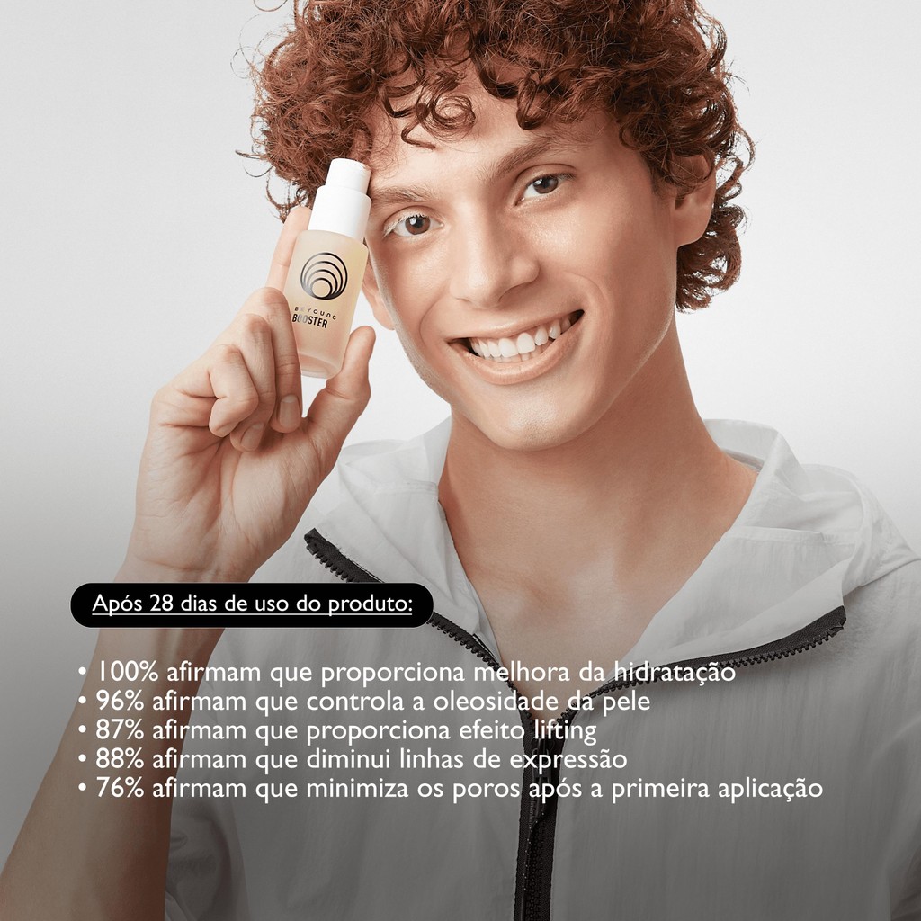 Sérum anti-idade.Beyoung Booster Multifuncionalé ideal para a redução dos primeiros sinais de idade, diminuindo linhas finas e de expressão e suavizando imperfeições da pele. Beyoung Booster é um sérum multifuncional, ideal para a redução dos primeiros sinais de idade, diminui linhas finas e de expressão e suaviza imperfeições da pele. Com ativos antioxidantes e rejuvenescedores que proporcionam o famoso efeito lifting instantâneo. Possui acabamento matte, tem um perfume delicado e fórmula leve, que é rapidamente absorvida, atingindo as camadas mais profundas da pele. Também auxilia no controle da oleosidade, minimiza os poros, aumenta a firmeza e deixa a pele naturalmente hidratada. Onde usar? Rosto, pescoço e colo. Quando usar? Diariamente: Manhã e noite. Tipo de pele? Todos os tipos. Acabamento? Matte. Textura? Sérum. CONHEÇA OS BENEFÍCIOS: - Rejuvenescimento; - Efeito lifting; - Antioxidante; - Controla a oleosidade; - Minimiza os poros; - Hidrata a pele.
