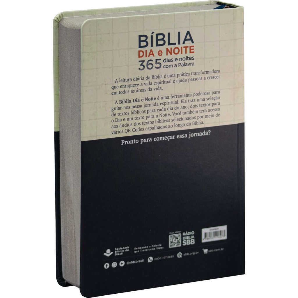 A leitura diária da Bíblia é uma prática transformadora que enriquece a vida espiritual e ajuda pessoas a crescer em todas as áreas da vida. Ao mergulhar nas Escrituras Sagradas, somos capacitados a viver uma vida significativa e a impactar positivamente o mundo ao nosso redor. A importância da leitura bíblica diária é enfatizada em várias passagens bíblicas. Por exemplo, Josué 1.8 diz: “Não cesse de falar deste Livro da Lei; pelo contrário, medite nele dia e noite, para que você tenha o cuidado de fazer segundo tudo o que nele está escrito; então você prosperará e será bem-sucedido” (p. 457). Essa prática nos ajuda a internalizar os ensinamentos divinos e a aplicá-los em nossa vida cotidiana. A Bíblia Dia e Noite é uma ferramenta poderosa para guiar-nos nessa jornada espiritual. Ela traz uma seleção de textos bíblicos para cada dia do ano; dois textos para o Dia e um texto para a Noite. Você também terá acesso aos áudios dos textos bíblicos selecionados por meio de vários QR Codes espalhados ao longo da Bíblia. Dessa forma, você poderá meditar na Palavra de Deus Dia e Noite, pois ler a Bíblia diariamente é uma prática importante para aqueles que desejam crescer em sua fé e se aproximar de Deus. Pronto para começar essa jornada? Nosso desejo é que você possa começar e terminar o ano caminhando com a Palavra de Deus e com o Deus da Palavra. Recursos : - A Bíblia em um ano - Impressão em duas cores - QR Code para o áudio dos textos bíblicos Detalhes do Produto : Tradução: Nova Almeida Atualizada Idioma: Português Tamanho da Letra: Normal Capa: Ilustrada Acabamento: Capa dura Medida: 13,5 x 21,0 cm Formato: Médio Páginas: 1536 páginas Índice: Não