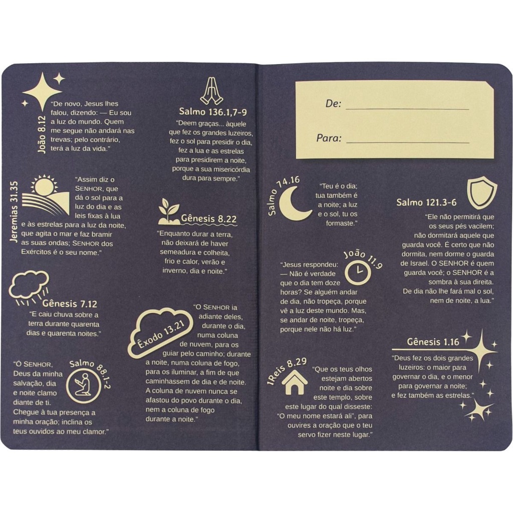 A leitura diária da Bíblia é uma prática transformadora que enriquece a vida espiritual e ajuda pessoas a crescer em todas as áreas da vida. Ao mergulhar nas Escrituras Sagradas, somos capacitados a viver uma vida significativa e a impactar positivamente o mundo ao nosso redor. A importância da leitura bíblica diária é enfatizada em várias passagens bíblicas. Por exemplo, Josué 1.8 diz: “Não cesse de falar deste Livro da Lei; pelo contrário, medite nele dia e noite, para que você tenha o cuidado de fazer segundo tudo o que nele está escrito; então você prosperará e será bem-sucedido” (p. 457). Essa prática nos ajuda a internalizar os ensinamentos divinos e a aplicá-los em nossa vida cotidiana. A Bíblia Dia e Noite é uma ferramenta poderosa para guiar-nos nessa jornada espiritual. Ela traz uma seleção de textos bíblicos para cada dia do ano; dois textos para o Dia e um texto para a Noite. Você também terá acesso aos áudios dos textos bíblicos selecionados por meio de vários QR Codes espalhados ao longo da Bíblia. Dessa forma, você poderá meditar na Palavra de Deus Dia e Noite, pois ler a Bíblia diariamente é uma prática importante para aqueles que desejam crescer em sua fé e se aproximar de Deus. Pronto para começar essa jornada? Nosso desejo é que você possa começar e terminar o ano caminhando com a Palavra de Deus e com o Deus da Palavra. Recurso A Bíblia em um ano Impressão em duas cores Recursos Adicionais · QR Code para o áudio dos textos bíblicos Tradução: Nova Almeida Atualizada Idioma: Português Tamanho da Letra: Normal Capa: Ilustrada Acabamento: Capa dura Medida: 13,5 x 21,0 cm Formato: Médio Páginas: 1536 páginas Índice: Não Indicado para: Crescimento Pessoal, Família ISBN: 9788531117473 Código: NA063BDN Peso: 0.710000 Kg