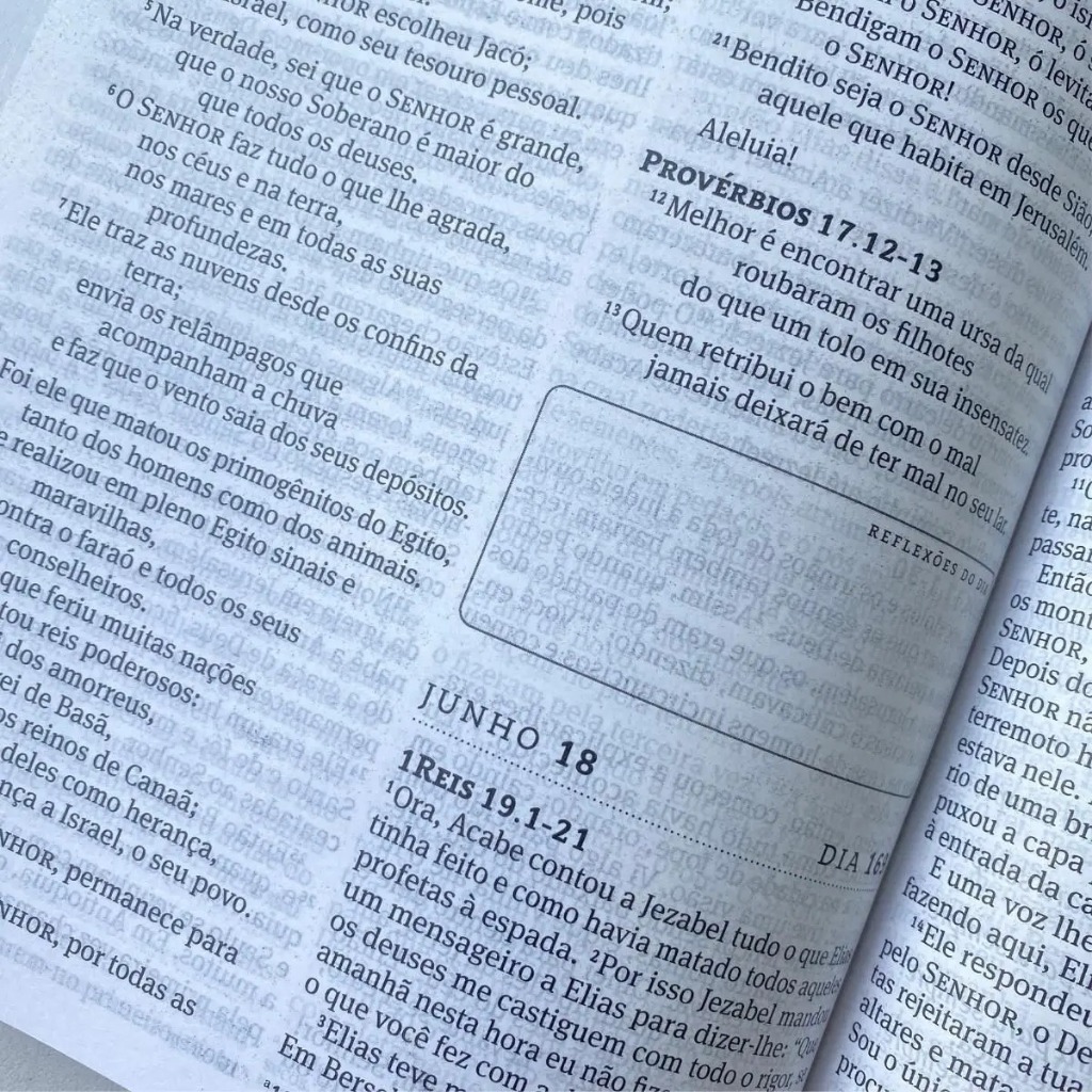 A Bíblia 365 é a ferramenta ideal para todos que desejam concluir a leitura da Bíblia em um ano. Com apenas 15 minutos por dia, leia porções selecionadas do Antigo Testamento, do Novo Testamento e dos livros de Salmos e de Provérbios, na sua versão bíblica de preferência. 16x23cm 1264 Páginas