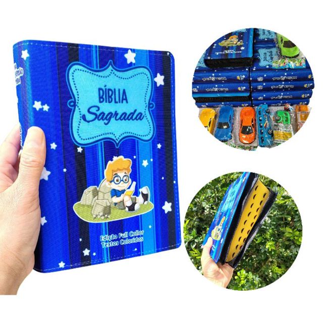 Bíblia Azul E Carrinho Infantil +, brinquedo Palavras De Jesus Em vermelho