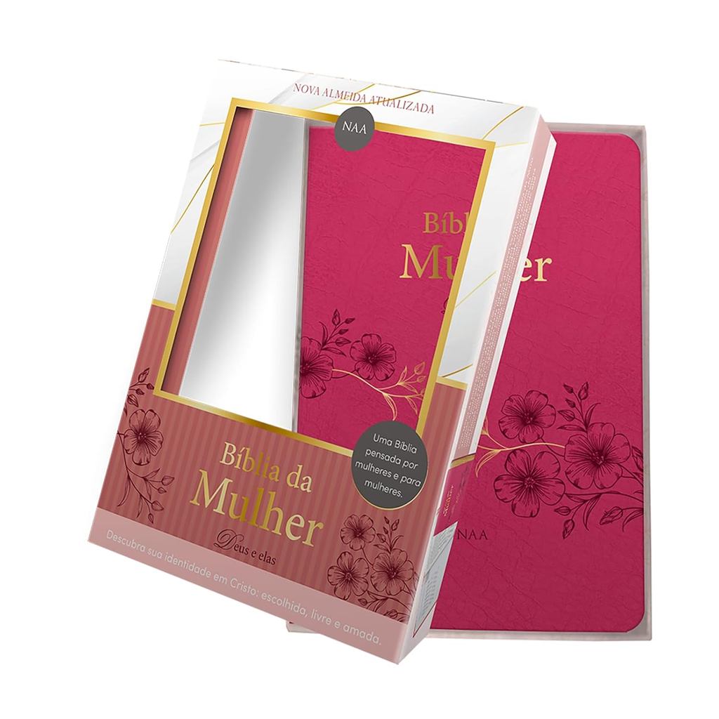 A Bíblia da Mulher ― Deus e Elas Uma Bíblia escrita por mulheres para mulheres, com linguagem acessível e visual moderno e limpo. Apresenta artigos, reflexões e recursos desenvolvidos por autoras reconhecidas como Lysa TerKeurst, Priscilla Shirer, Christine Caine, Jackie Hill Perry, Lisa Harper, entre outras, com o propósito de oferecer uma leitura edificante e transformadora. Utiliza a consagrada versão Nova Almeida Atualizada (NAA), da Sociedade Bíblica do Brasil (SBB), disponível em três opções de capa e impressa em papel de alta qualidade, garantindo durabilidade e facilidade no manuseio. Recursos desta Bíblia: Apresentação dos gêneros literários bíblicos, com plano de leitura de passagens selecionadas Introdução de cada livro da Bíblia com panorama geral e perfil cronológico Mais de 100 artigos para reflexão pessoal Seção “Conheça o termo”, detalhando significados e relevância de palavras ou expressões bíblicas Seção “Para refletir”, com sugestões de aplicação pessoal da leitura bíblica “Observe atentamente”, com mais de 90 comentários sobre trechos bíblicos Mais de 25 perfis de mulheres na Bíblia, com perguntas para aplicação pessoal Frases inspiradoras de autoras renomadas da Lifeway Gráficos, tabelas e mapas coloridos Três planos de leitura bíblica em um, dois e três anos